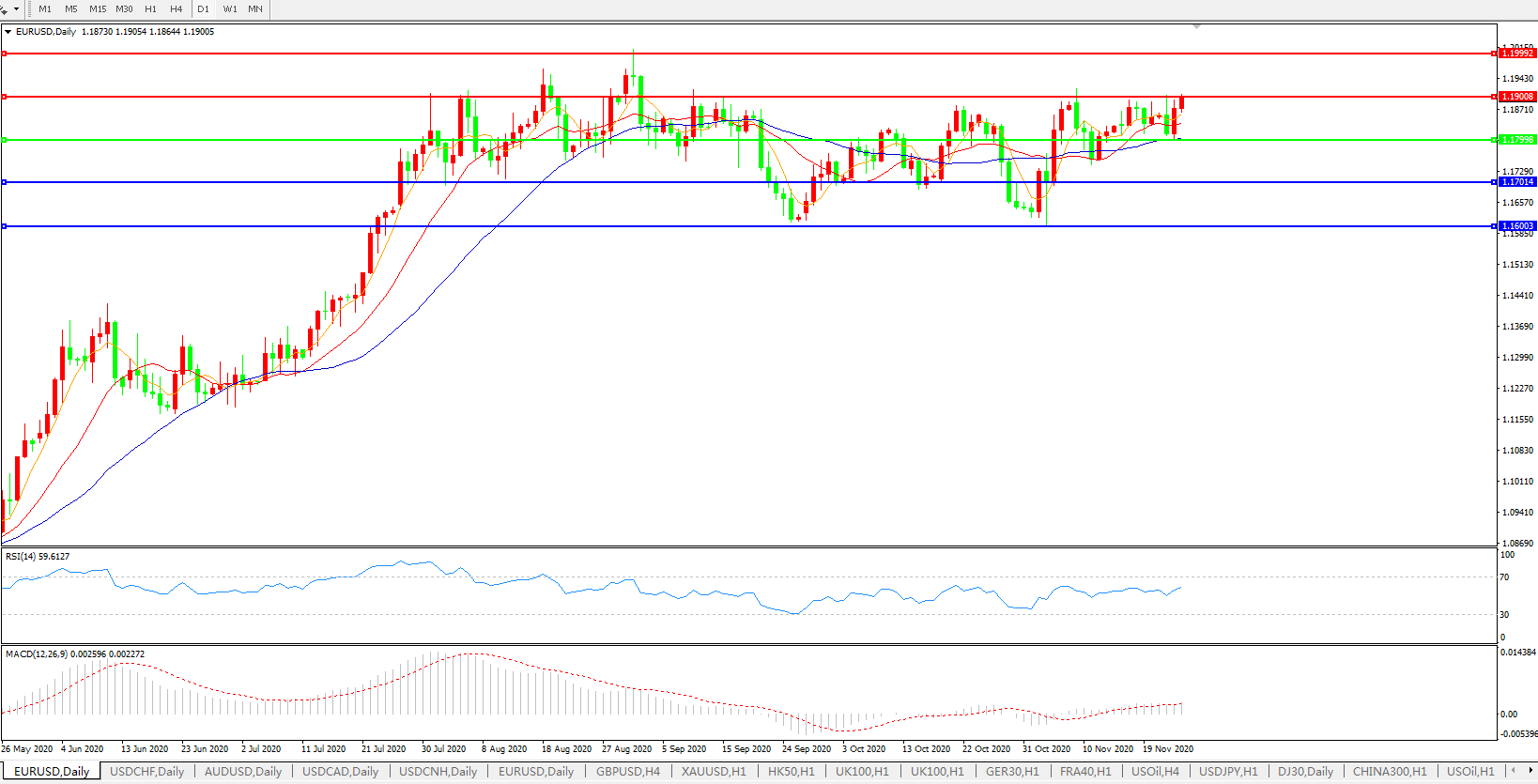 欧元兑美元在周一一度短暂触及1.19关口,但之后在纽约时段受美国经济数据向好消息打压跳跌逾百年,退守1.18关口,但周二欧市盘初,欧元再度恢复升势,上行收复了周一大半跌幅,上行趋势得以重新建立;分析师指出,美欧疫情近期出现戏剧性转折局面,一方面欧洲国家在实施封锁措施后新发病例略有回落,另一方面美国大选前后的人群聚集活动却使得新感染人数创出新高,这扭转了此前的汇市风向;与此同时,美国政局的不确定性正在倒逼美联储在此后进一步扩大宽松政策,而眼下的局面也显示无论何方入主白宫,下一任期内全面财政宽松政策都是唯一选项,这令国际投资者对美元汇价前景更加看空;相反,欧元区日内进一步向好的数据也支撑了欧元汇价重新走强; 分析师因而预计欧元汇价有大概率会在后市重新上触并站稳1.19关口,原因在于美国政局风险短期内仍难以排除,而这一趋势也有望将进一步推动欧元兑美元上攻年内高位1.2011,但这很大程度上仍要观望下周欧洲央行的政策措辞指引