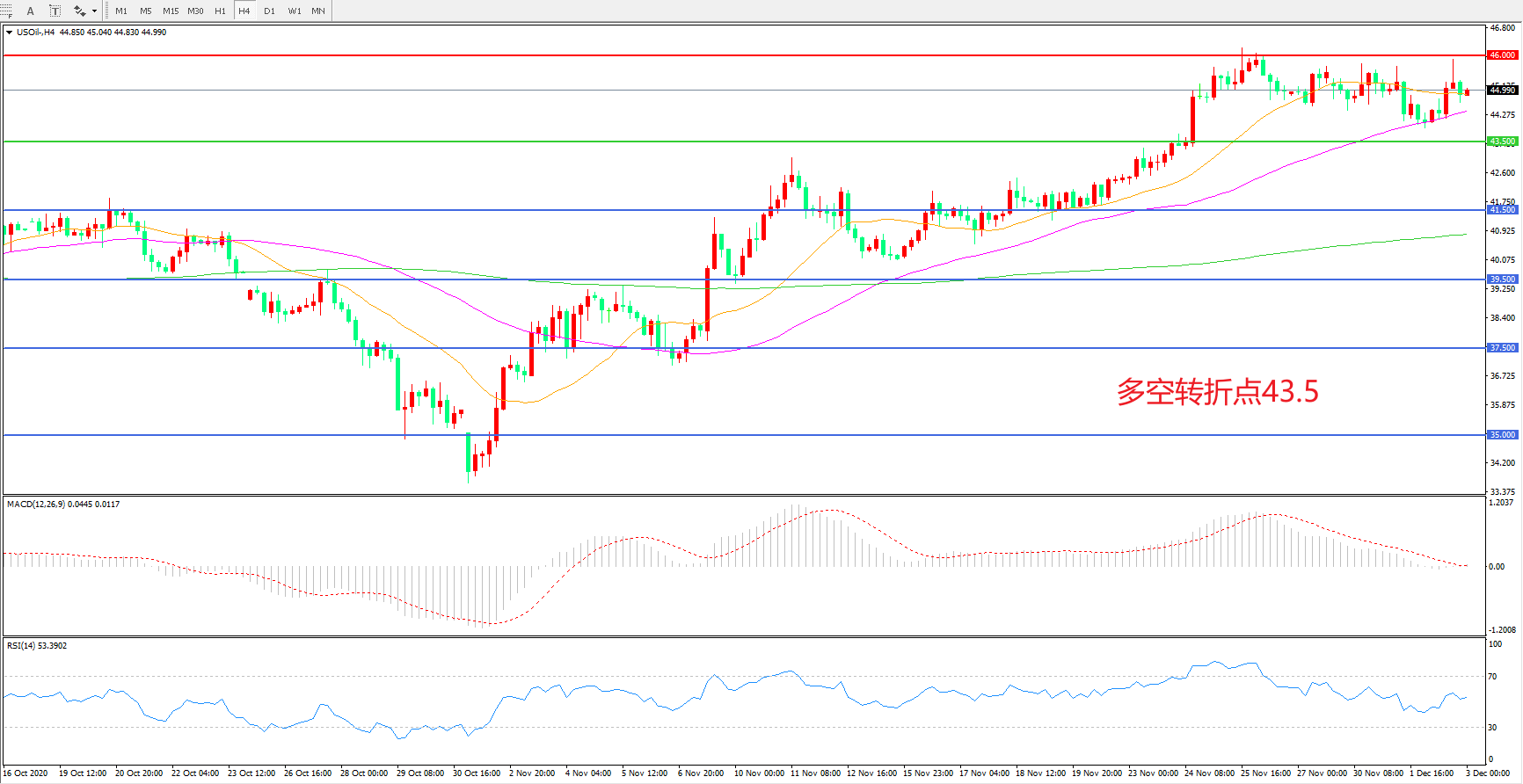 周三(122日),油价上涨受到新冠疫苗利好消息提振,以沙特和俄罗斯为首的 OPEC+联盟已经朝着达成新版石油产出协议取得进展,美国WTI原油小幅冲高尾盘回落后收报44.94美元/桶。目前市场对全球经济前景的预期相对乐观,同时对美国财政刺激政策的乐观预期也支撑了油价。根据昨晚公布的EIA数据显示,美国EIA原油库存减少67.9万桶,差于预期,库存升幅远超预期,且精炼油库存变化值录得11个星期以来的首次增长。数据公布后,美油曾短线快速走低,但在乐观情绪的支撑下,油价依然保持着相对强势。