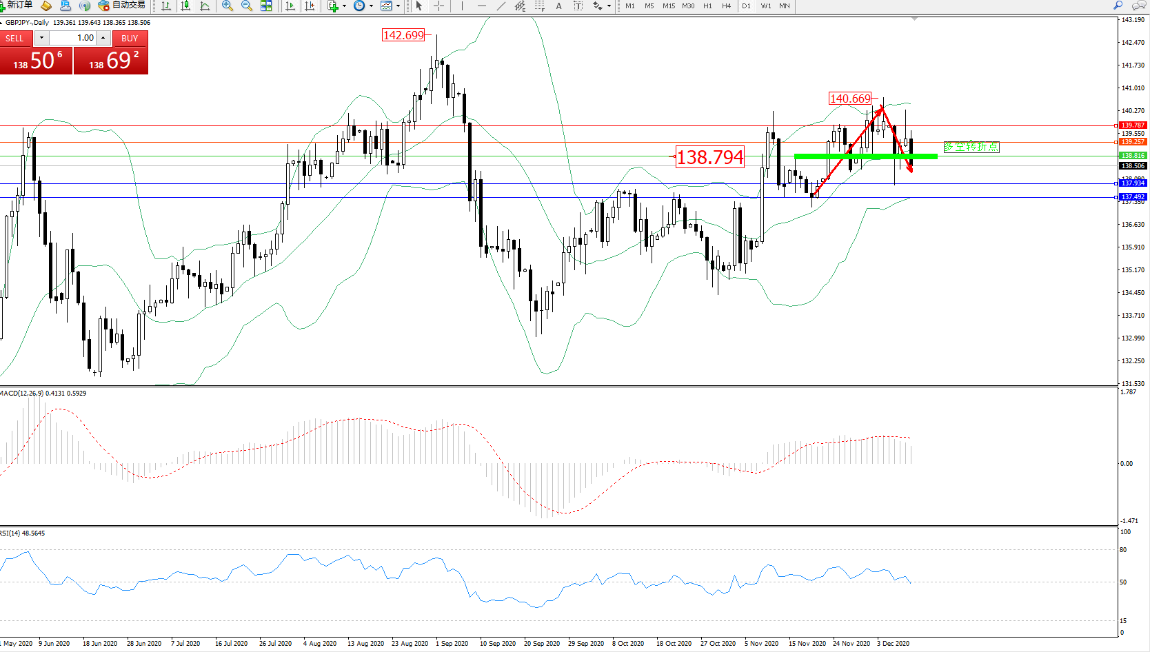技术点评:低位多头动力长时间维持在布林带指标通道内中上轨区间持续宽幅震荡上移,高位抵达140.669附近遇阻开始震荡下行,纠结于布林带指标中轨附近来回巨震走势中,多空动力短期处于宽幅焦灼状态,布林带指标呈上行趋势后开始整理平移,关注中轨下方附近节点,MACD指标处于多头区域高位弱势徘徊后开始整理下移,RSI指标处于多头区域持续弱势震荡回撤至50均衡线附近徘徊中;