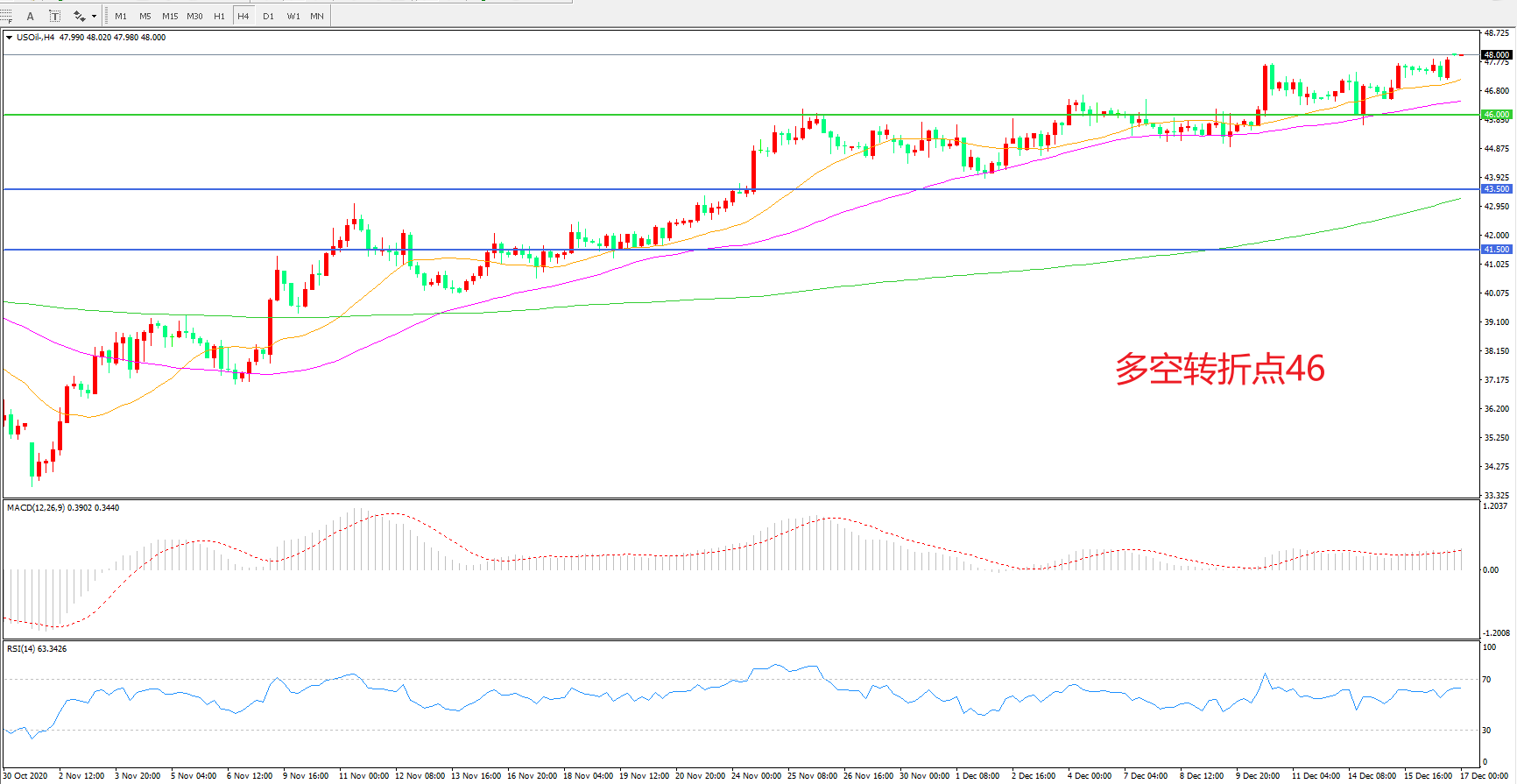 4小时图看,油价高位震荡后长阳拉升,低点逐渐抬高, 46美元形成有力支撑,均线系统呈多头排列,MACD红柱增加,RSI指标走平,日内震荡上行概率较大。