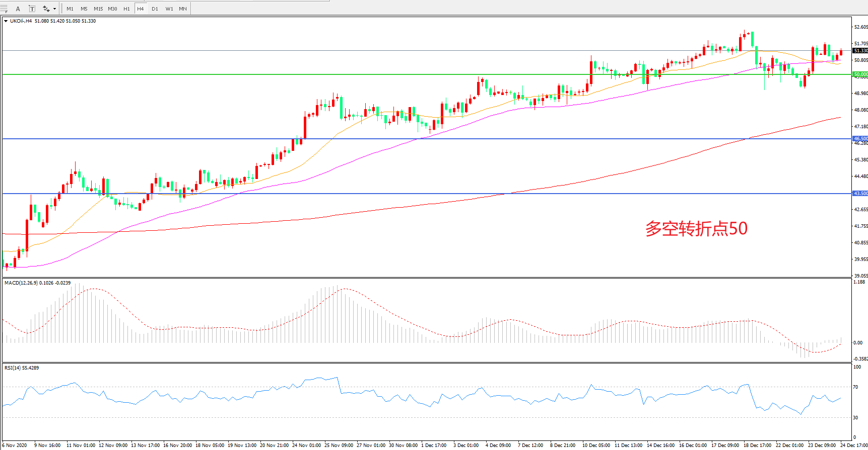 周四(12月24日),由于临近圣诞假期,市场成交量和市场参与人数都有所下降,美国布伦特原油在假日清淡交投中小幅走高,收报51.33美元/桶。自10月底以来,随着疫苗在许多国家获得批准,原油市场大幅反弹。目前在全球范围内,感染人数仍在增加,未来油价走势仍将受到疫情影响。今日,市场将因圣诞节假期休市一天。
