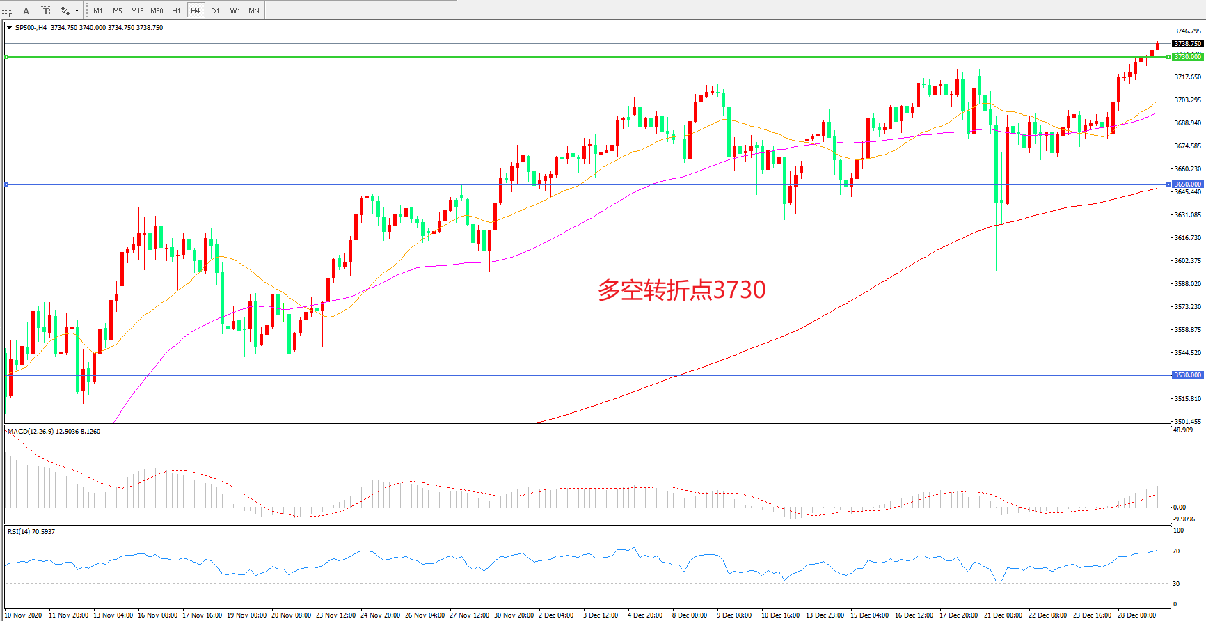 4小时图看,标普500震荡上行,整体表现较为强势,均线系统有拐头迹象,3730成为多空分水岭,MACD红柱增加,RSI指标走平,日内延续上行概率较大。
