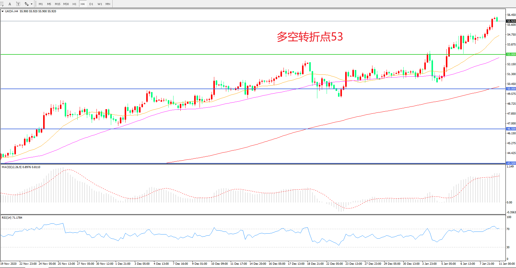 2021年开年首周,原油价格继续上行,周线大幅上涨!布伦特原油大幅上行,收报52.50美元/桶。在此前技术指标出现见顶迹象后,沙特的一则消息硬是把价格再次拉回到涨势之中,空头打压油价的愿望进一步落空,空仓等待的多头也失去了低价入场的机会。如果未来验证疫苗有效,那么原油价格就会在强势的基础上继续前行。