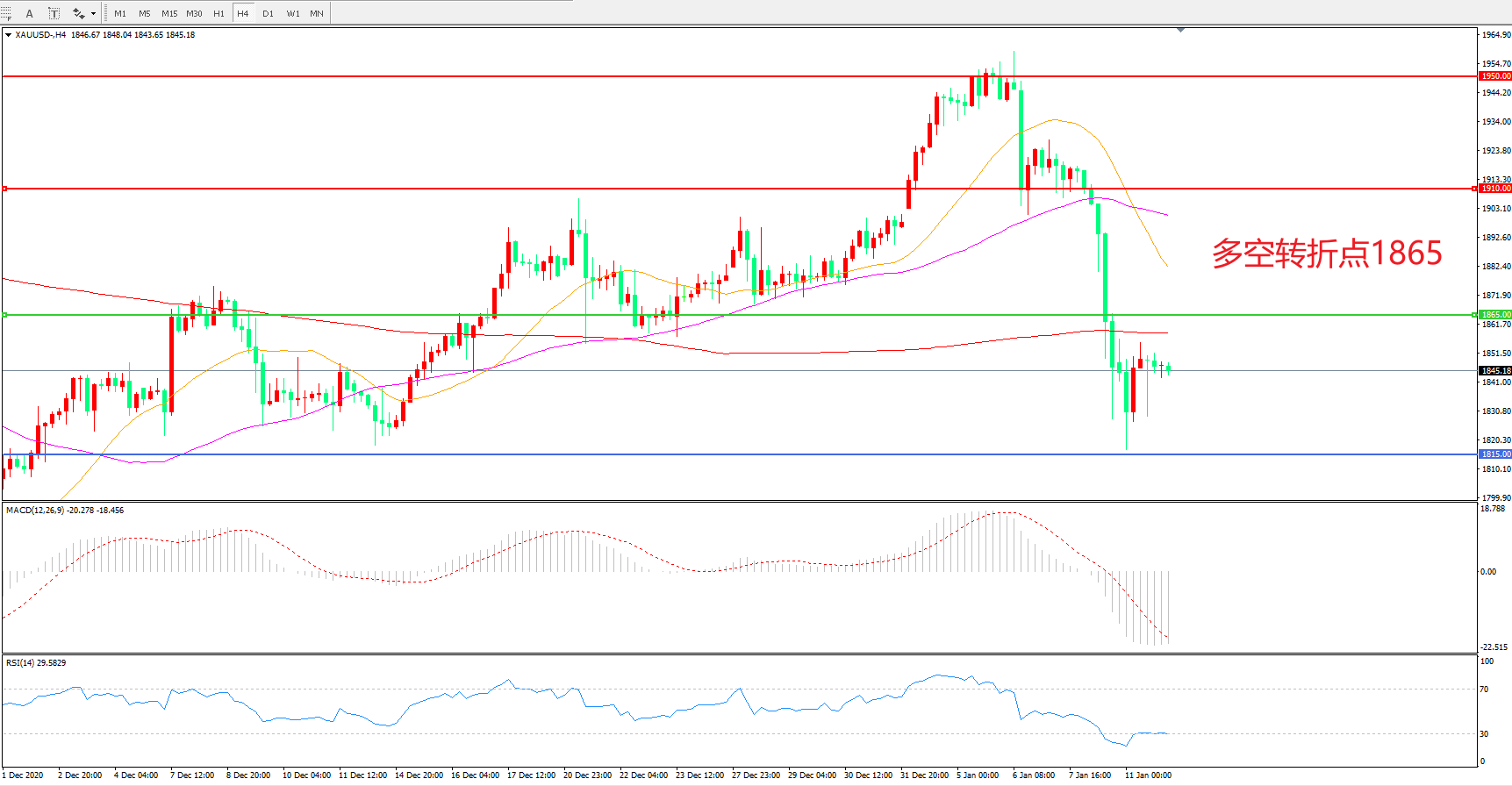 周一(1月11日),受助于美国10年期国债收益率上涨,美元指数再度大涨0.72%,美指刷新日高至90.72,现货黄金一度暴跌40美元,之后反弹回升,收报1845.27美元/盎司。目前市场押注当选总统拜登将在上任后推动快速出台更多刺激措施,长期美债收益率势将突破去年3月达到过的难以攻破的高位,并在上方全新的更高区域站稳,金价短期内仍将继续承压。