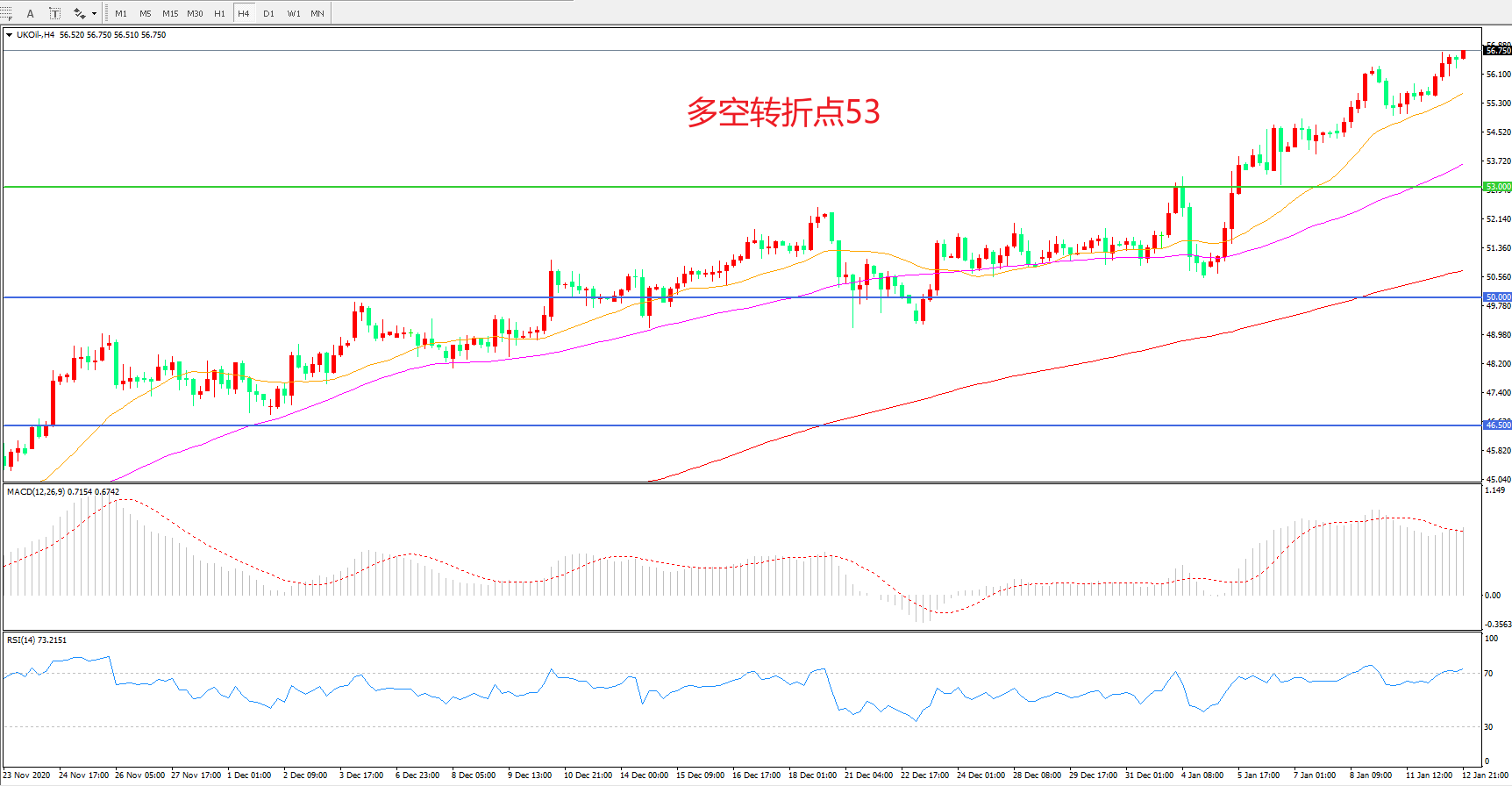 4小时图看,油价阳线连续拉升,反弹高点逐渐抬高,多头趋势十分明显,均线系统呈多头排列,MACD红柱减少,RSI指标走平,日内震荡上行概率较大。