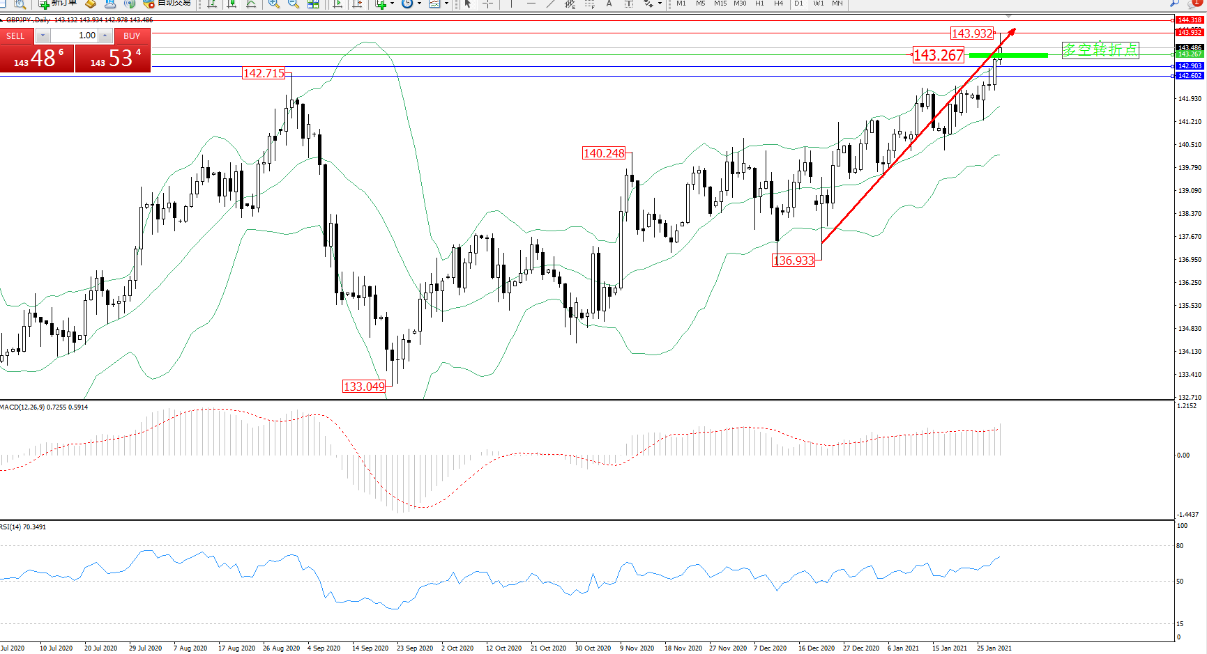 英镑兑日圆高位持续拉升至143.486附近震荡,在英国封锁政策的前提下,英国首相鲍里斯·约翰逊(Boris Johnson)表示政府将在港口和机场强制执行这一规定:询问人们为什么要离开,如果他们没有合理的理由,就必须原路返回。所有入境后需要在酒店进行隔离的人员,他们会配有专门的机场接机,然后直接被送往隔离室,在此期间会有人为他们进行核酸检测。为了给疫苗的注射留出更多的时间和准备,英国政府不得不再一次加强入境管控。目前酒店隔离政策的具体细节还在讨论中,预计本周会给到最新的信息。此外,在强制隔离的范围应该有多大的问题上,政府内部出现了不同的观点。