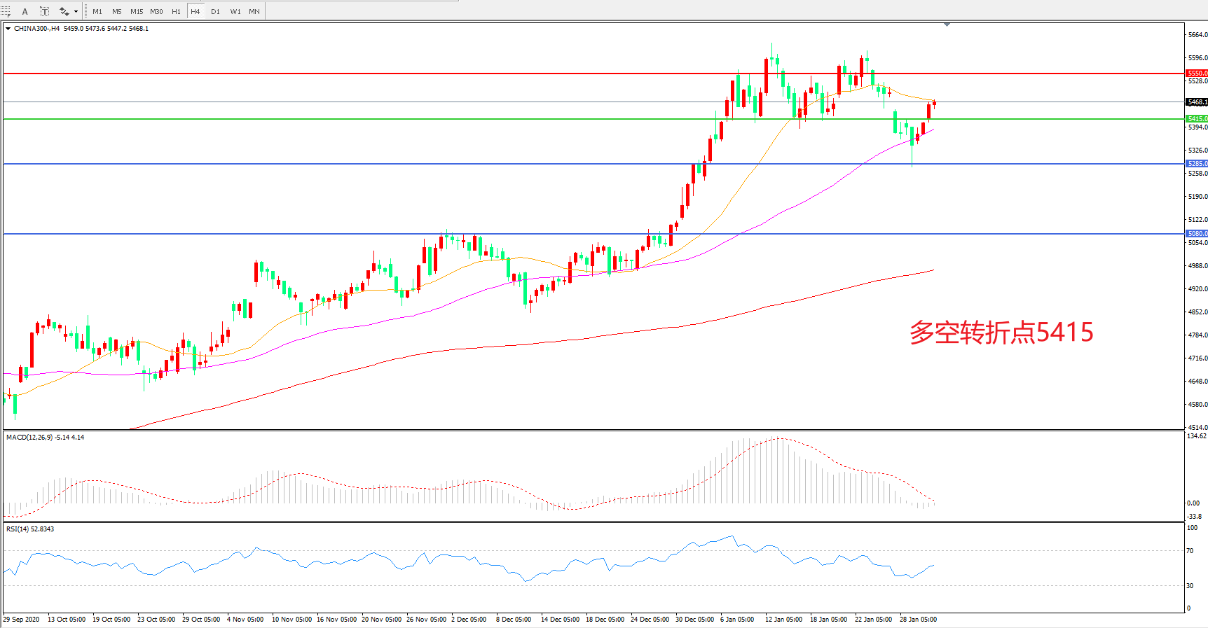 4小时图看,沪深300近期表现回暖,回踩55周期均线后震荡反弹,短期走势有所回暖,5415成为短期多空分水岭,MACD绿柱缩短,RSI指标向上,日内延续震荡概率较大。