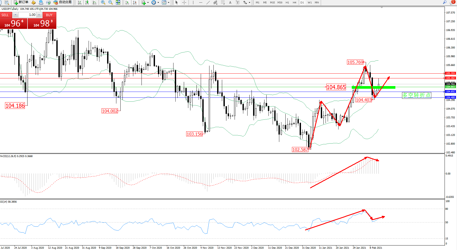 技术点评:多头动力延续布林带指标通道上轨附近持续上行至105.764附近节点,高位遇阻后急速回撤下行,即将触及布林带指标通道中轨附近节点,多头动力强势反转向上移动,关注中上轨区间关键节点,布林带指标呈张口走势后有收口走势迹象,MACD指标处于0轴线上方多头区域维持整理平移后有下行迹象,RSI指标处于多头区域维持整理后急速下行后强势整理平缓上移;