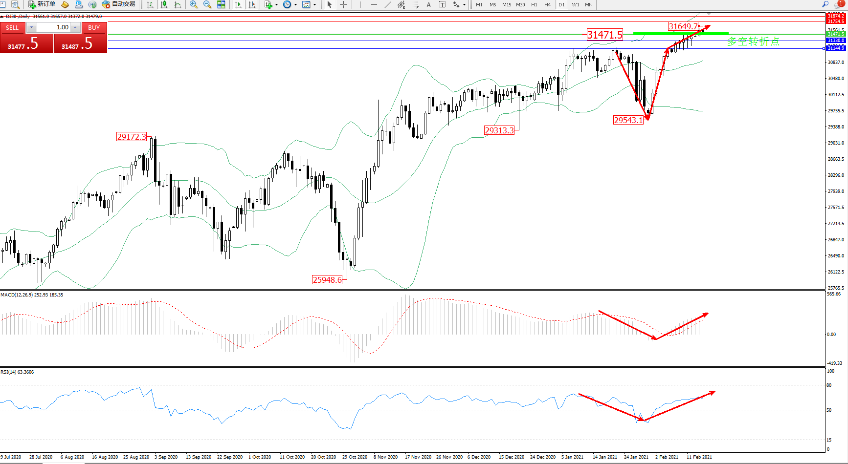 交易策略:31471上方看涨,目标31754、31874