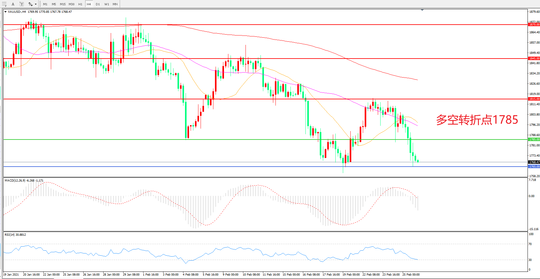 周四(2月25日),美国公布当周初请失业金人数,录得73万人,少于市场预期,同时公布的还有美国1月耐用品订单,也录得六个月来最大增幅。现货黄金闻讯大跌,较日内高点回落25美元,最终收报1769.31美元/盎司。美国上周初请失业金人数大幅减少,意味着随着新冠疫情传染率的下降以及接种活动的加快,美国经济将继续走强,对美元形成提振。