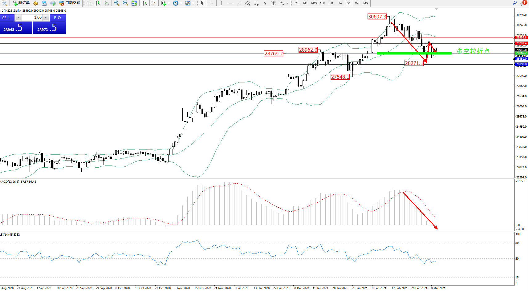 技术点评:高位空头动力维持震荡下行,低位跌破布林带指标下轨附近节点抵达28271位置后开始反转上移,高位空头动力出现短暂减弱迹象,短暂回升后维持在下轨上側弱势徘徊,布林带指标呈张口走势持续中,关注中轨附近关键节点,MACD指标处于多头区域高位震荡下行即将触及0轴线附近节点,RSI指标处于多头区域维持震荡下行至50均衡线附近弱势徘徊中;