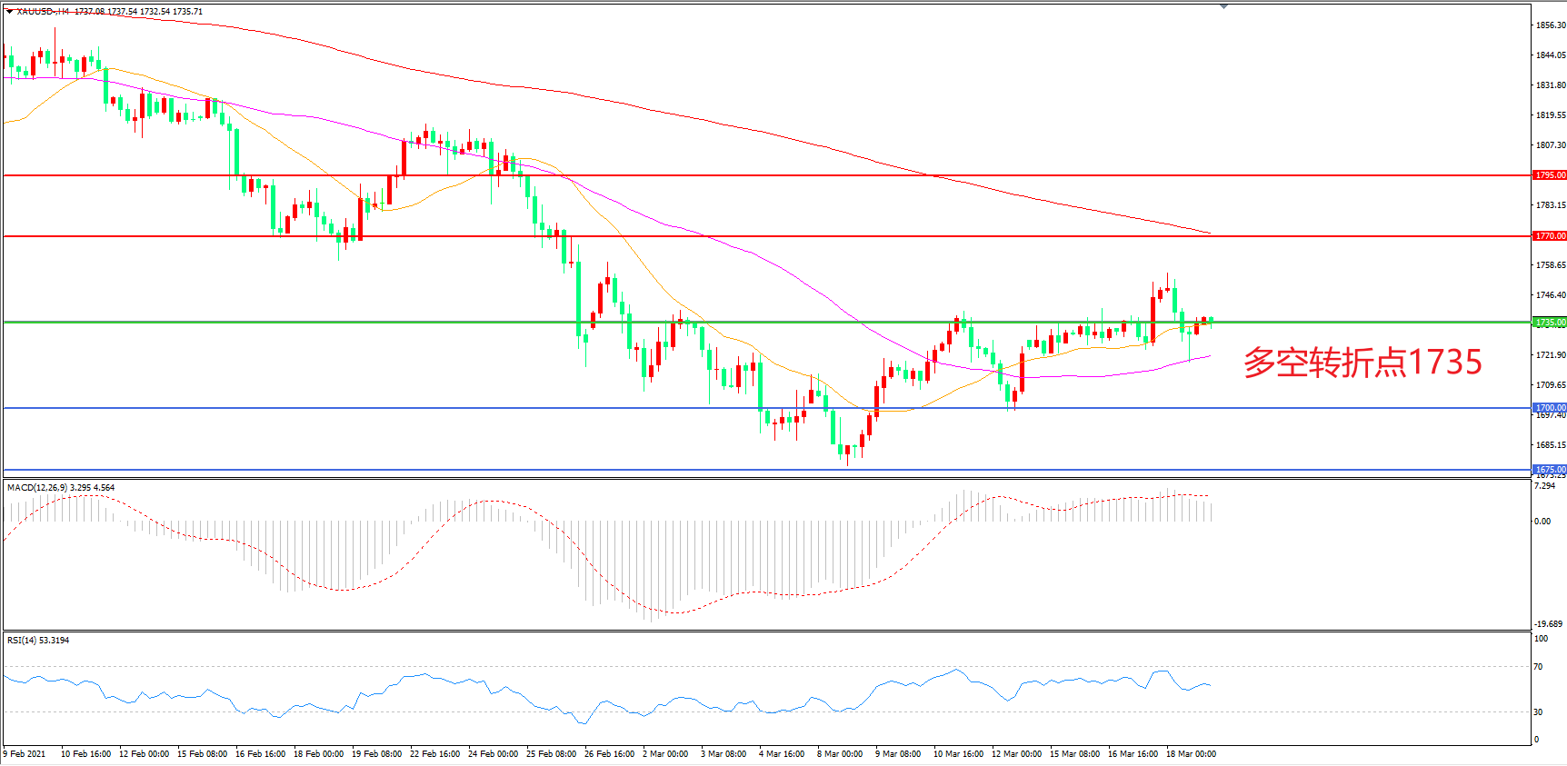 4小时图看,金价以21周期均线为依托展开整理,整体波幅不大,1735成为短期多空分水岭,形态上有形成头肩底的可能,MACD红柱缩短,RSI指标走平,日内延续震荡概率较大。