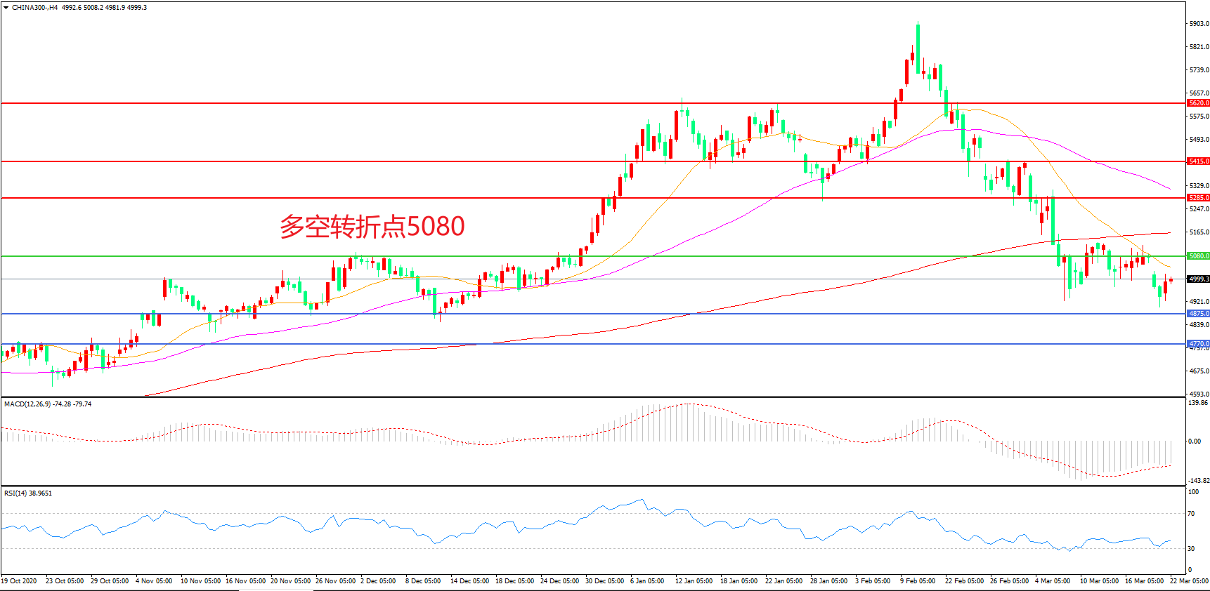 4小时图看,沪深300低位震荡企稳,但整体依然受制于21周期均线,4875成为短期支撑,MACD绿柱缩短,RSI指标走平,日内延续震荡概率较大。