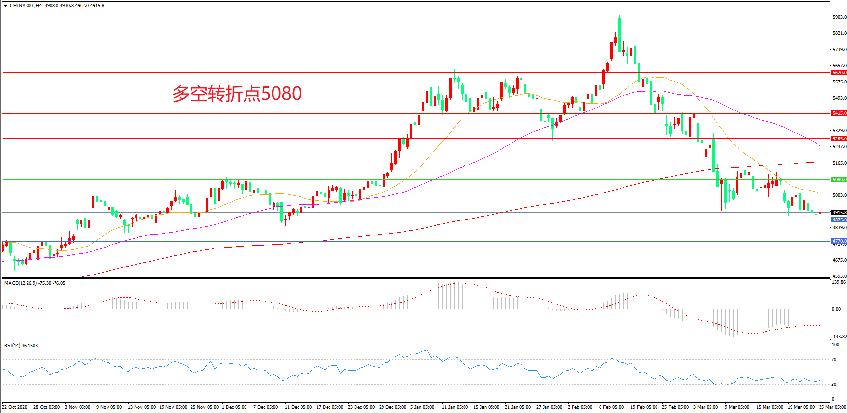 4小时图看,沪深300延续低位震荡形态,整体波幅不大,21周期均线成为上方阻力,4875成为下方支撑,MACD绿柱缩短,RSI指标走平,日内延续震荡概率较大。