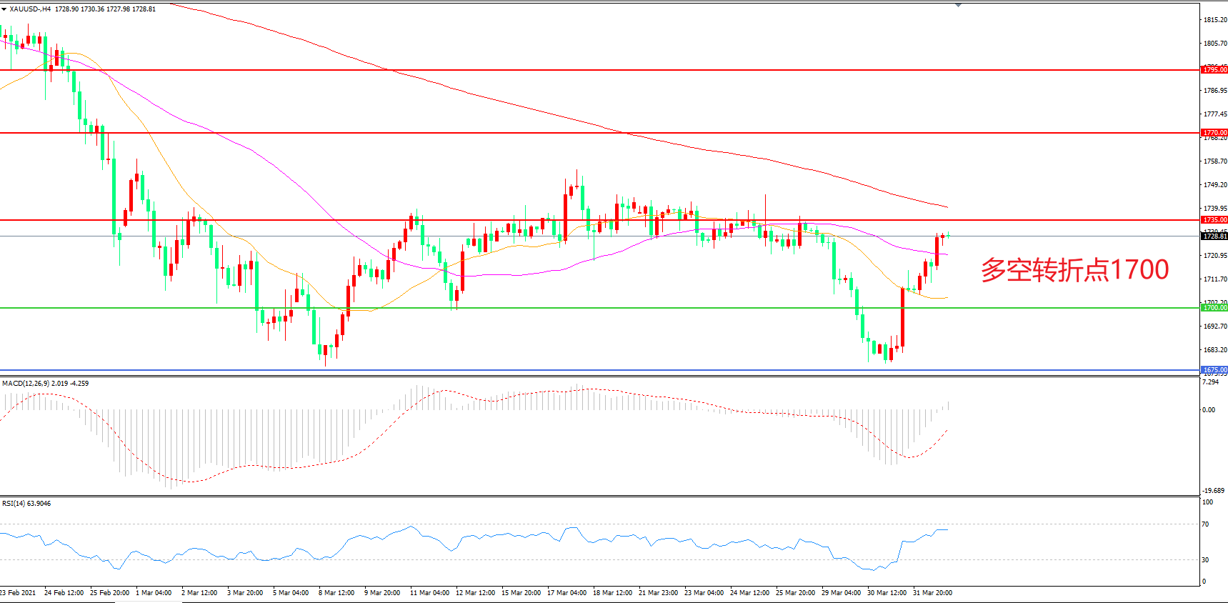 周四(4月1日),投资者权衡拜登2.25万亿美元刺激计划的影响之际,美债收益率脱离近期高位大幅下跌,美元指数失守93关口为金价提供了良好的上涨环境,现货黄金大涨逾20美元,收报1728.81美元/盎司。周五(4月2日)是耶稣受难日,欧美金融市场休市一天,周末后金价有望迎来新的机遇。