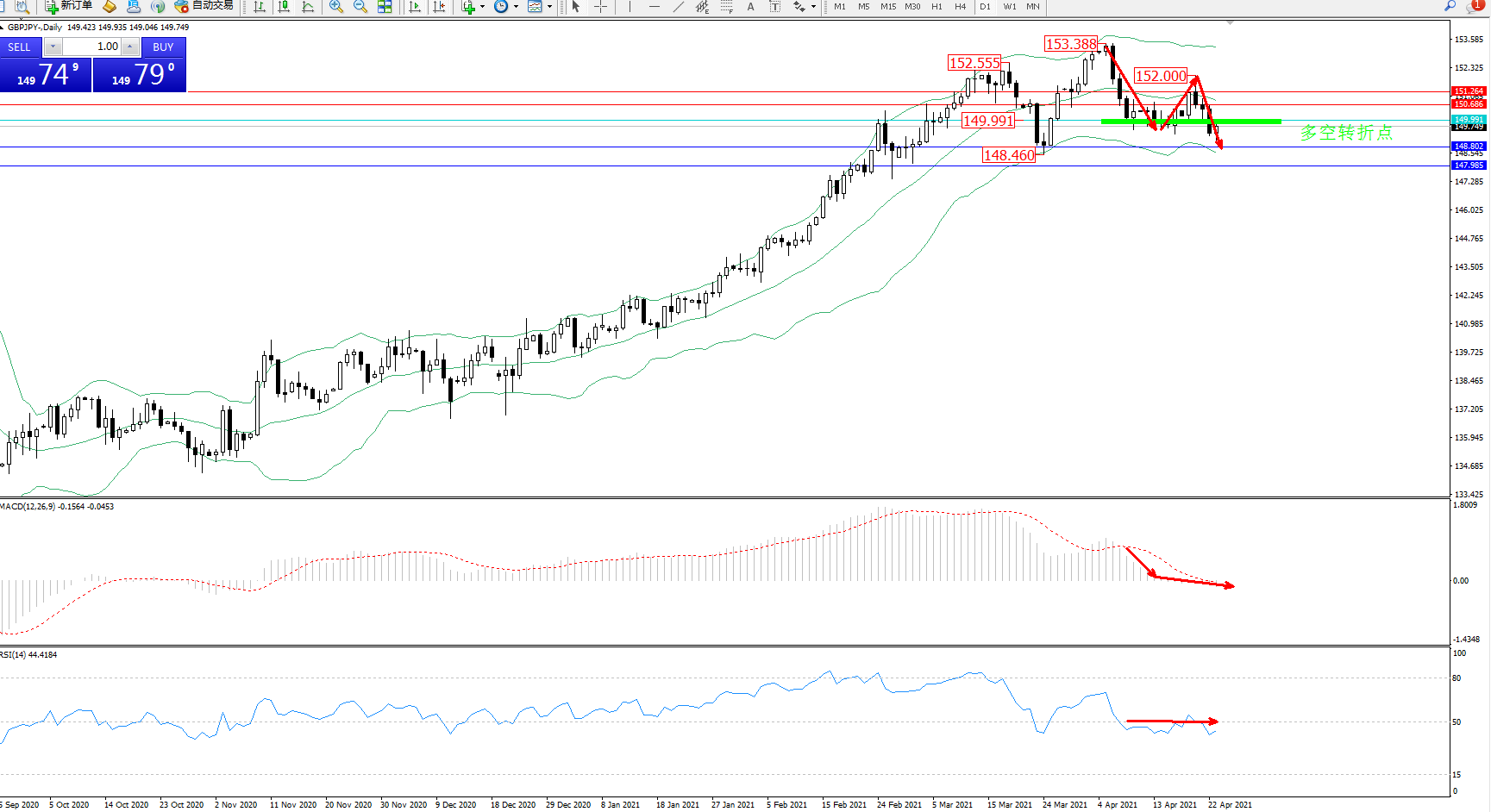 技术点评:多头动力延续布林带指标通道持续震荡上扬,高位触及153.388位置后震荡回撤下行,纠结于中下轨区间弱势整理平移,多头动力有伺上移迹象,触及中轨附近节点后再度震荡下行,布林带指标呈张口平移走势良好,关注下轨附近支撑节点,MACD指标高位空头动力震荡下行至0轴线附近节点开始徘徊,RSI指标纠结于50均衡线下方弱势整理;