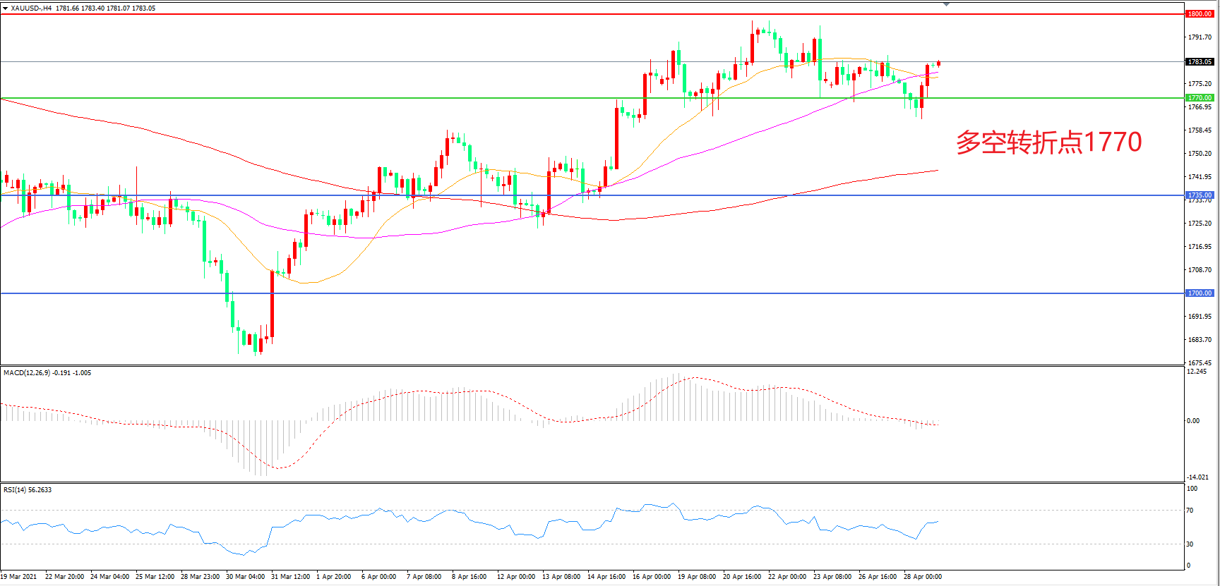 4小时图看,金价回踩1770一线后再度拉升,短线走势有所回暖,形态上有突破上行可能,均线系统走平,MACD红柱减少,RSI指标走平,日内延续震荡概率较大。