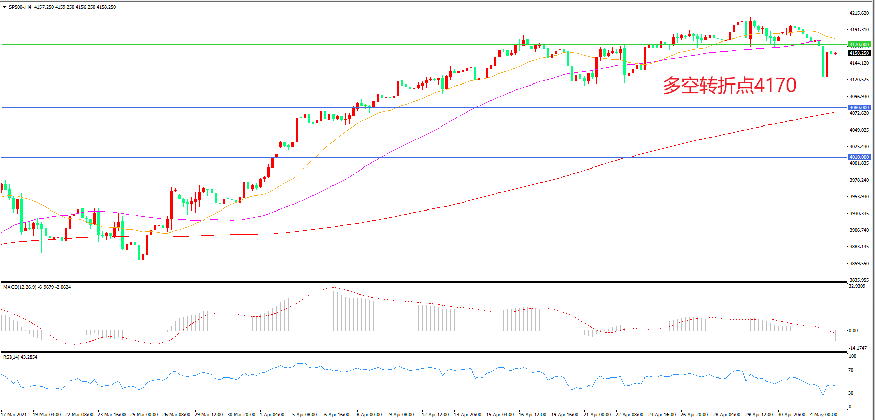 4小时图看,标普500高位震荡后长阴下破,短线走势陷入低迷,均线系统逐渐粘合,4170成为多空分水岭,MACD绿柱增加,RSI指标走平,日内延续震荡概率较大。