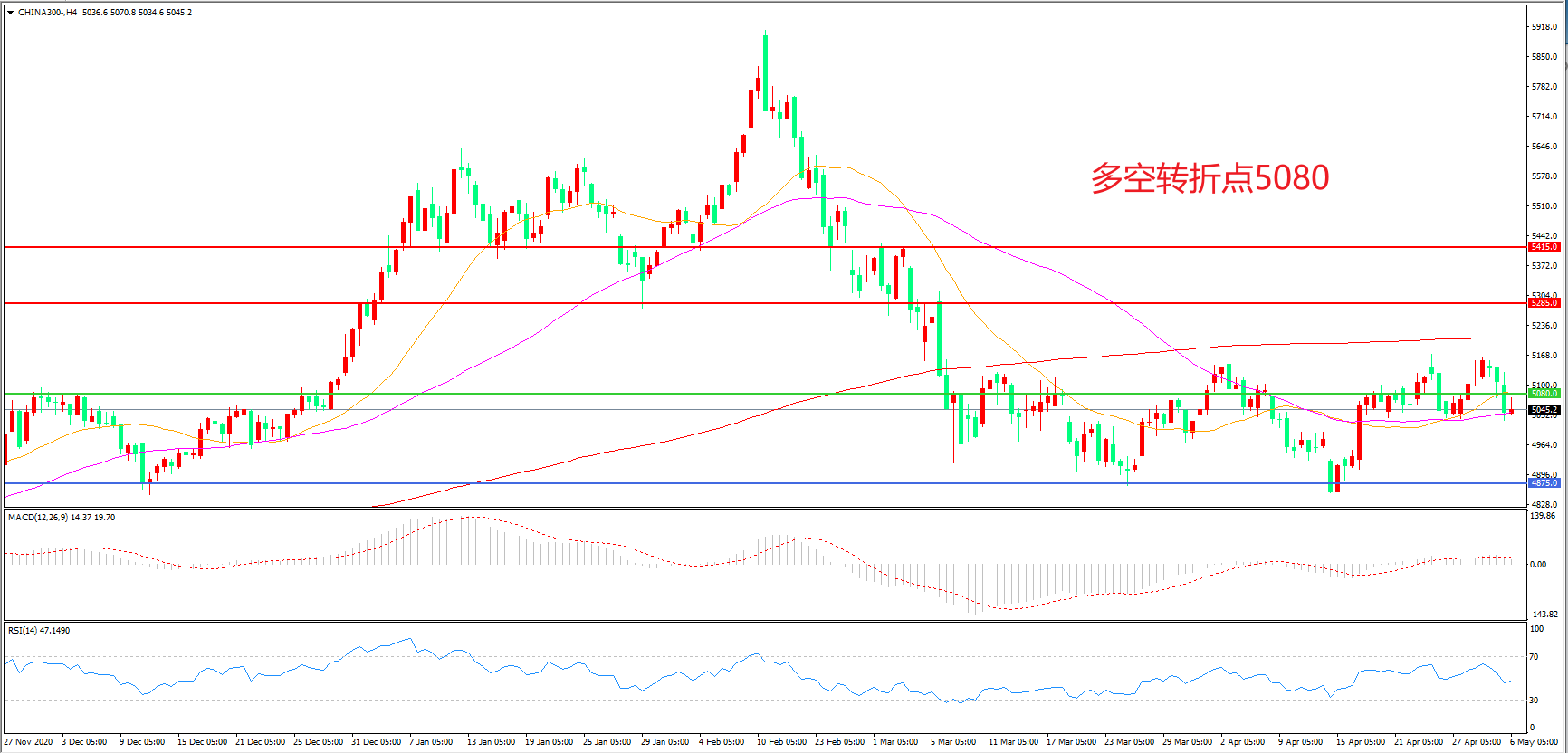 4小时图看,沪深300冲高回落,整体收到200周期均线的压制,55周期均线成为下方支撑,5030成为多空分水岭, MACD红柱增加,RSI指标走平,日内延续震荡概率较大。