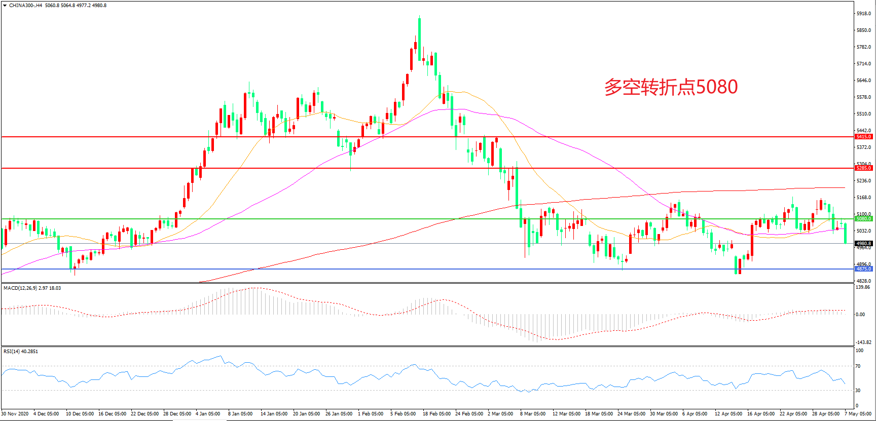 4小时图看,沪深300长阴破位,整体表现十分低迷,55周期均线支撑被击穿,5080成为上方阻力, MACD红柱缩短,RSI指标向下,日内震荡下行概率较大。