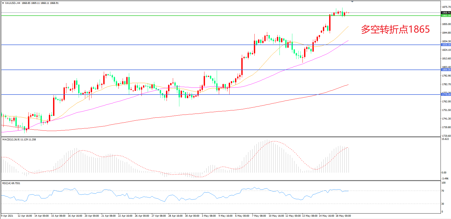 周二(5月18日),美元指数早盘转跌后持续下行,跌破90大关,美债收益率终结了此前迅猛的涨势,开启了延续至今的盘整行情,现货黄金延续高位震荡,收报1868.61美元/盎司。目前投资者正在等待美联储会议纪要以衡量该行经济复苏时期通货膨胀的容忍度,如果美联储依然认为通胀飙升是暂时的,将继续容忍通胀加速,这会使美元兑大多数主要货币贬值,“汹涌而来”的通胀也将使金价获得长期支撑。