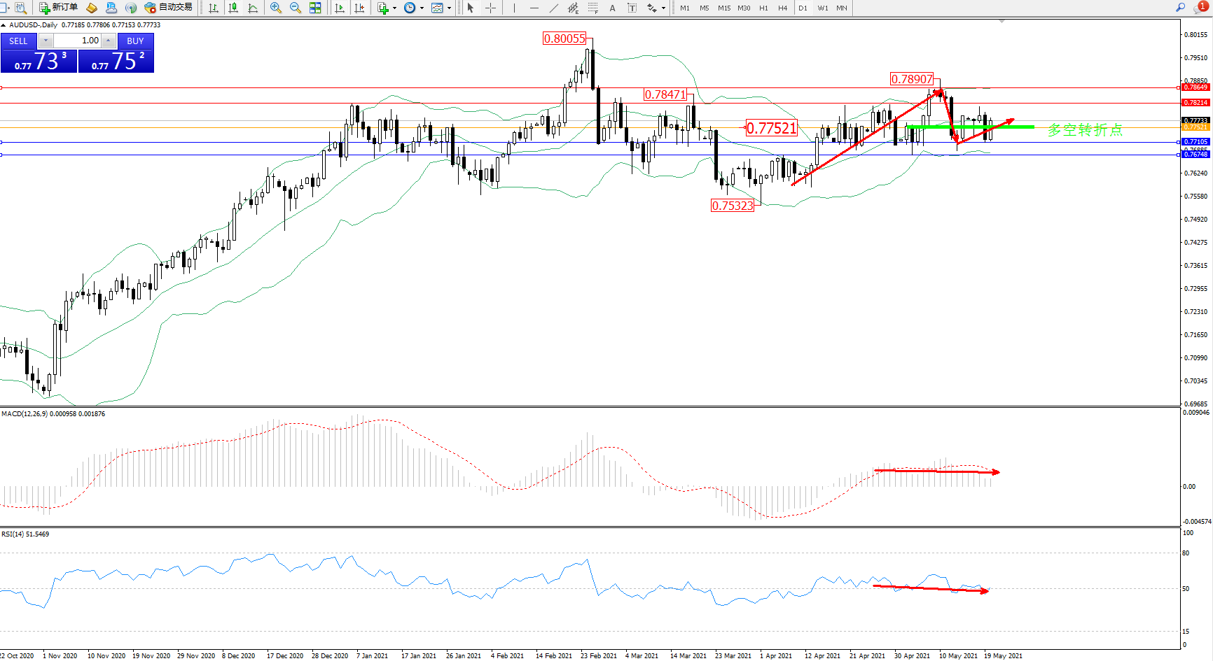 备选策略:0.77521下方看跌,目标0.77105、0.76748
