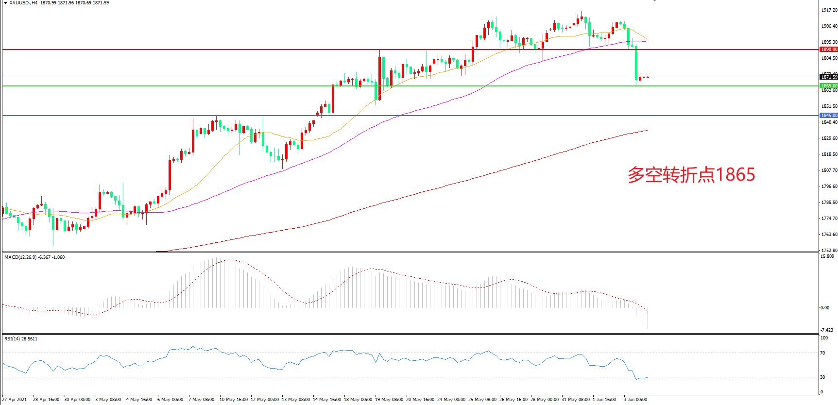 周四(6月3日),有“小非农”之称的ADP就业数据表现惊艳,97.8万人的结果创去年6月以来新高,强劲的数据令市场更加担心美联储会更早地开始缩减购债规模,美元因此走强现货黄金遭到猛烈抛售,短线狂泻逾40美元后,收报1871.16美元/盎司。今晚20:30分,市场将迎来最重磅的非农就业数据,务必重点关注。