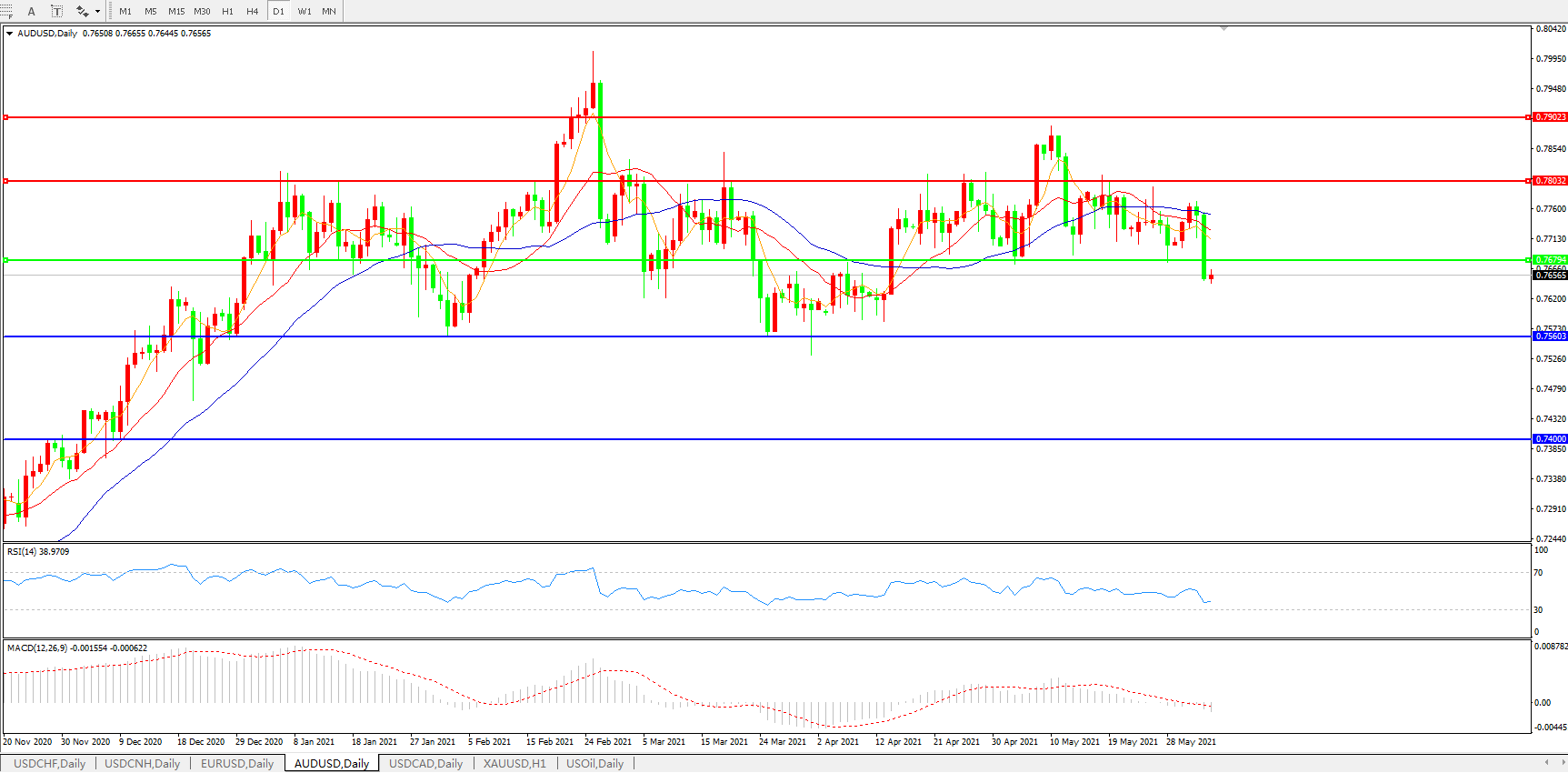 交易策略:0.7680下方看跌,目标0.7560、0.7400