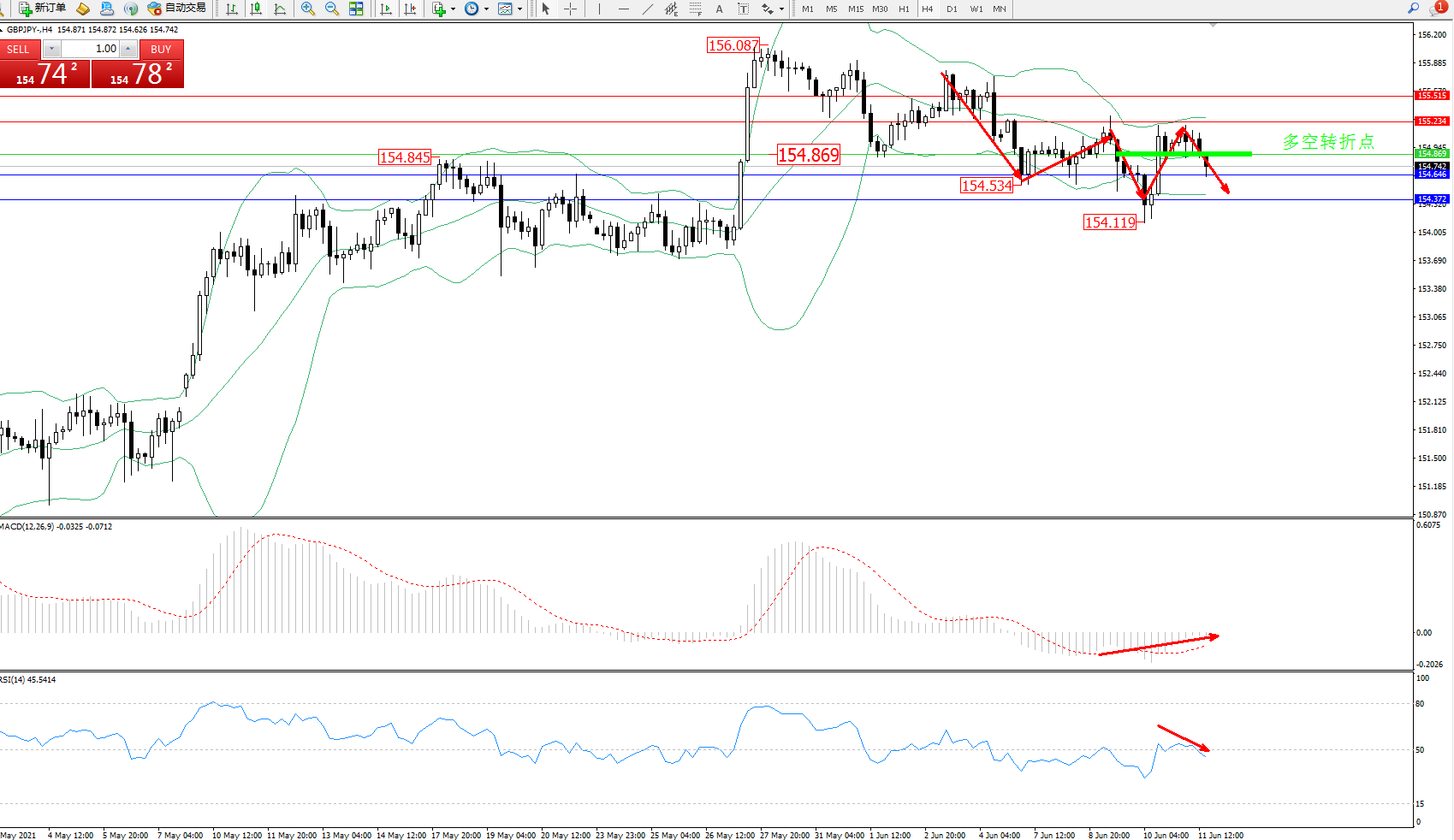 技术点评:空头动力长时间维持在布林带指标通道内呈阶梯式震荡向下移动,低位抵达154.119位置后再度得到支撑反转向上拉升,触及上轨附近节点后开始整理平移,然后续上行动力欠缺,短期震荡后再度进入中下轨区间下移,布林带指标呈收口走势平移,关注中轨附近节点,MACD指标处于0轴线下方空头区域维持窄幅整理中,RSI指标处于50均衡线附近徘徊后有下移迹象;