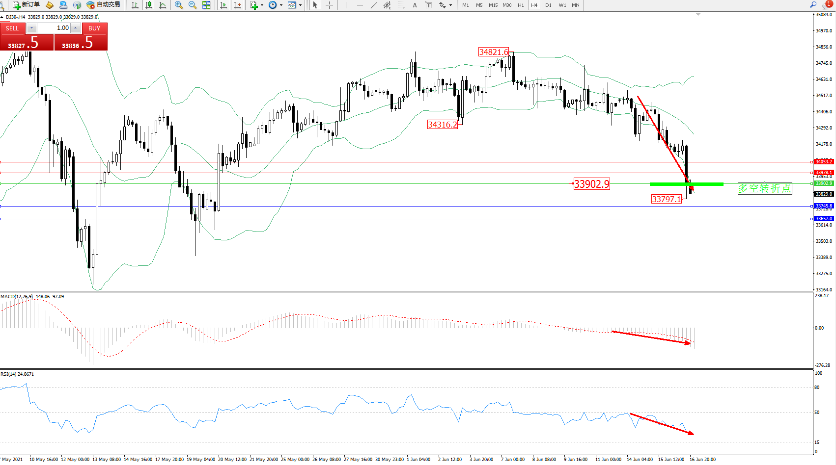 道琼斯指数DJ30——4小时K线图显示: