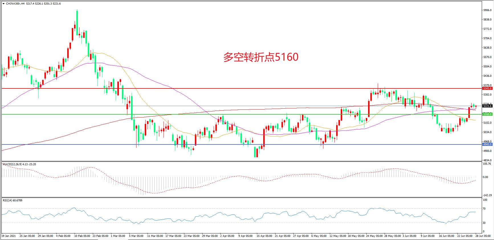 4小时图看,沪深300长阳拉升后延续高位震荡,短线行情受到提振,均线系统的阻力区间被突破,5160成为多空分水岭,MACD绿柱缩短,RSI指标走平,日内延续上行概率较大。