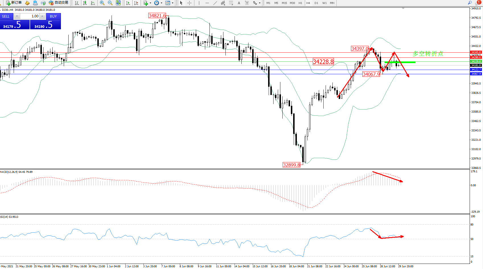 交易策略:34228下方看跌,目标34122、34067