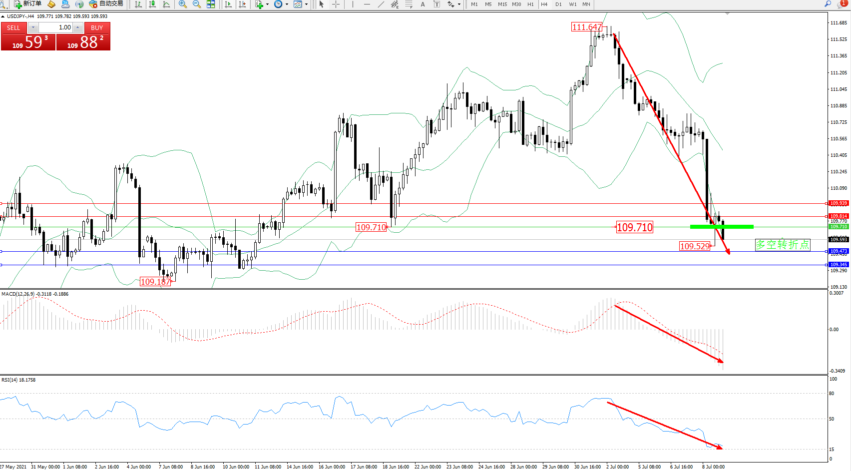 技术点评:高位空头动力延续布林带指标下轨附近急速下挫,跌破下轨附近节点抵达109.529位置短暂回升,但下行趋势动力强劲,未能企稳而后再度下探,跌势未有止步态势,布林带指标呈张口走势持续中,MACD指标处于空头区域低位持续下行中,RSI指标处于空头区域低位持续震荡下移后底部开始弱势整理;