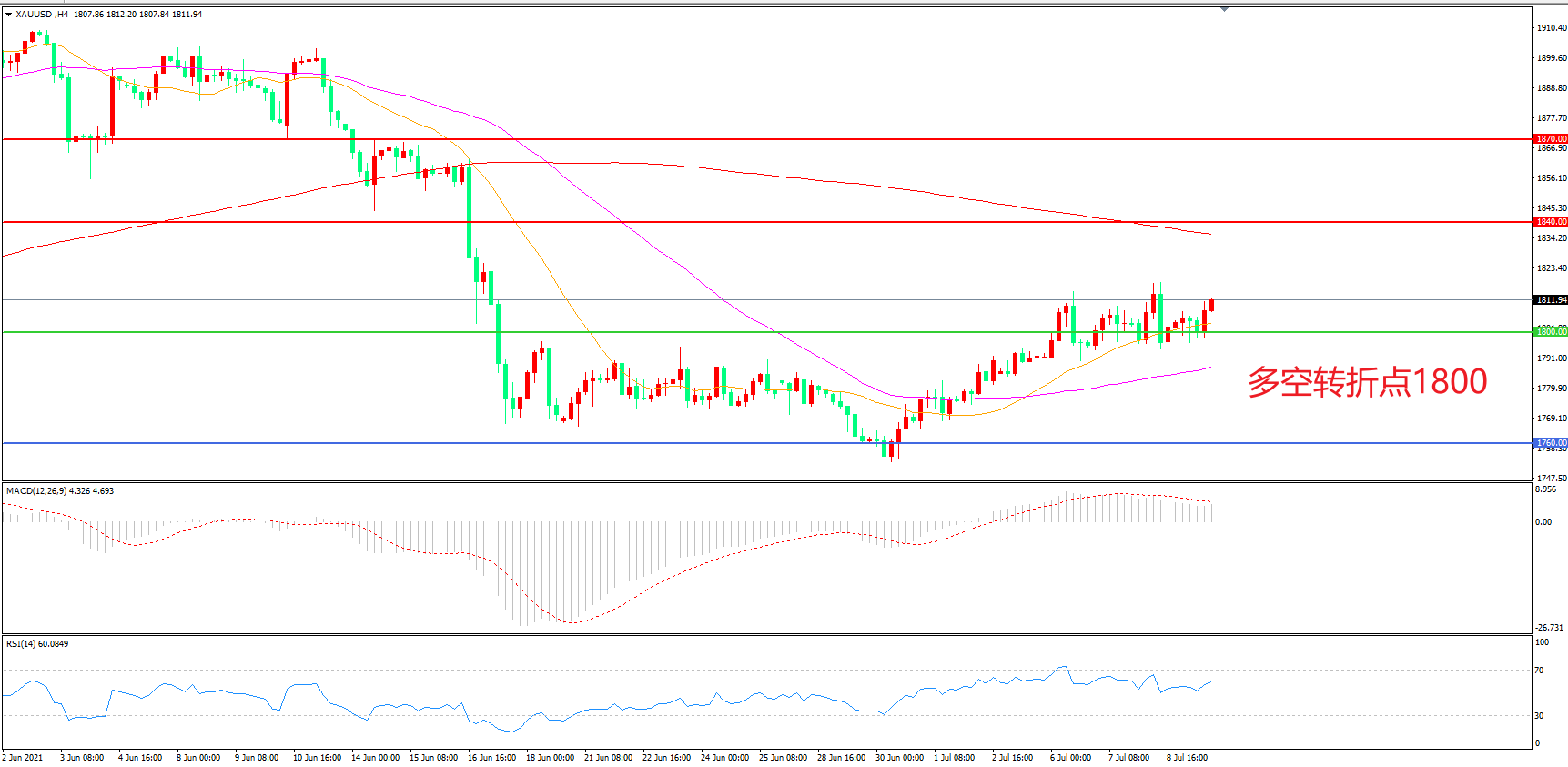 交易策略: 在1800.00之上看涨,目标1840.00 1870.00