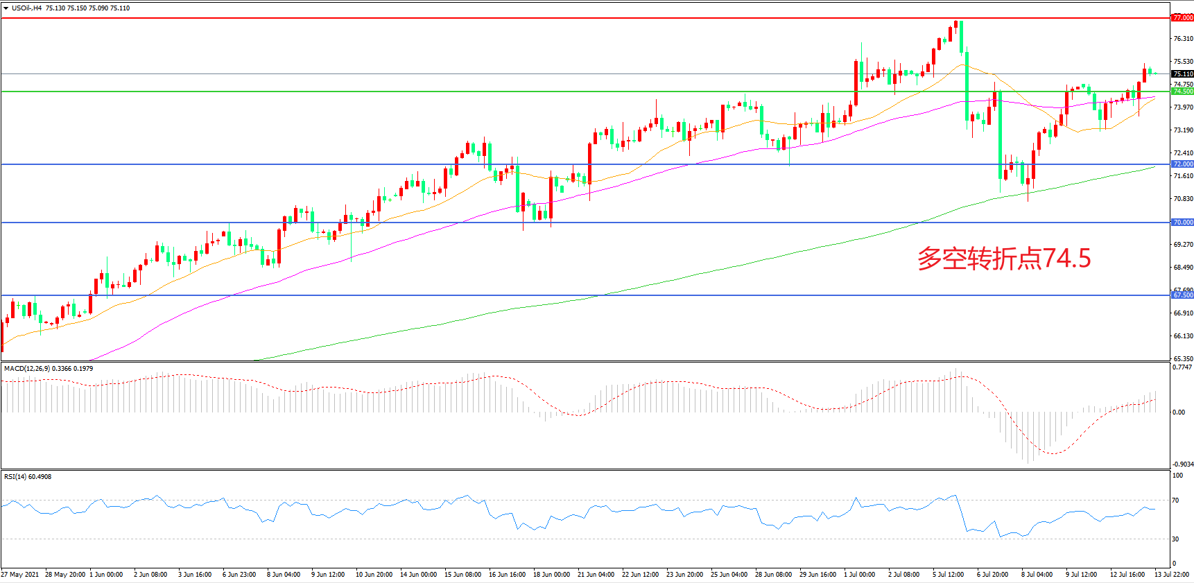 4小时图看,油价以21周期均线为依托小幅反弹,74.5美元成为短期多空分水岭,短期均线上穿形成金叉,RSI指标走平,日内震荡上行概率较大。