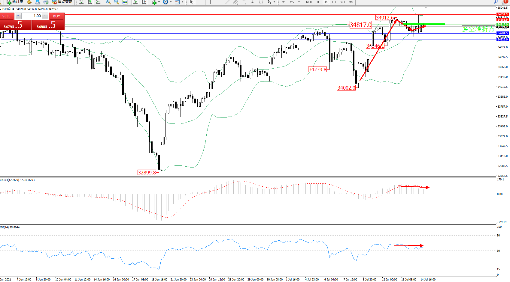 技术点评:低位多头动力持续震荡上扬,高位抵达34912位置节点后遇阻整理回撤,即将触及布林带指标中轨附近节点,布林带指标呈收口走势持续中,MACD指标处于0轴线上方多头区域维持整理平移,RSI指标处于50均衡线上方多头区域持续震荡平移;