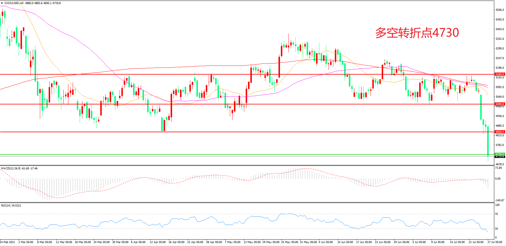4小时图看,沪深300长阴连续下破,整体表现十分低迷,4850成为上方阻力,4730成为多空分水岭,均线系统拐头向下,日内延续下行概率较大。