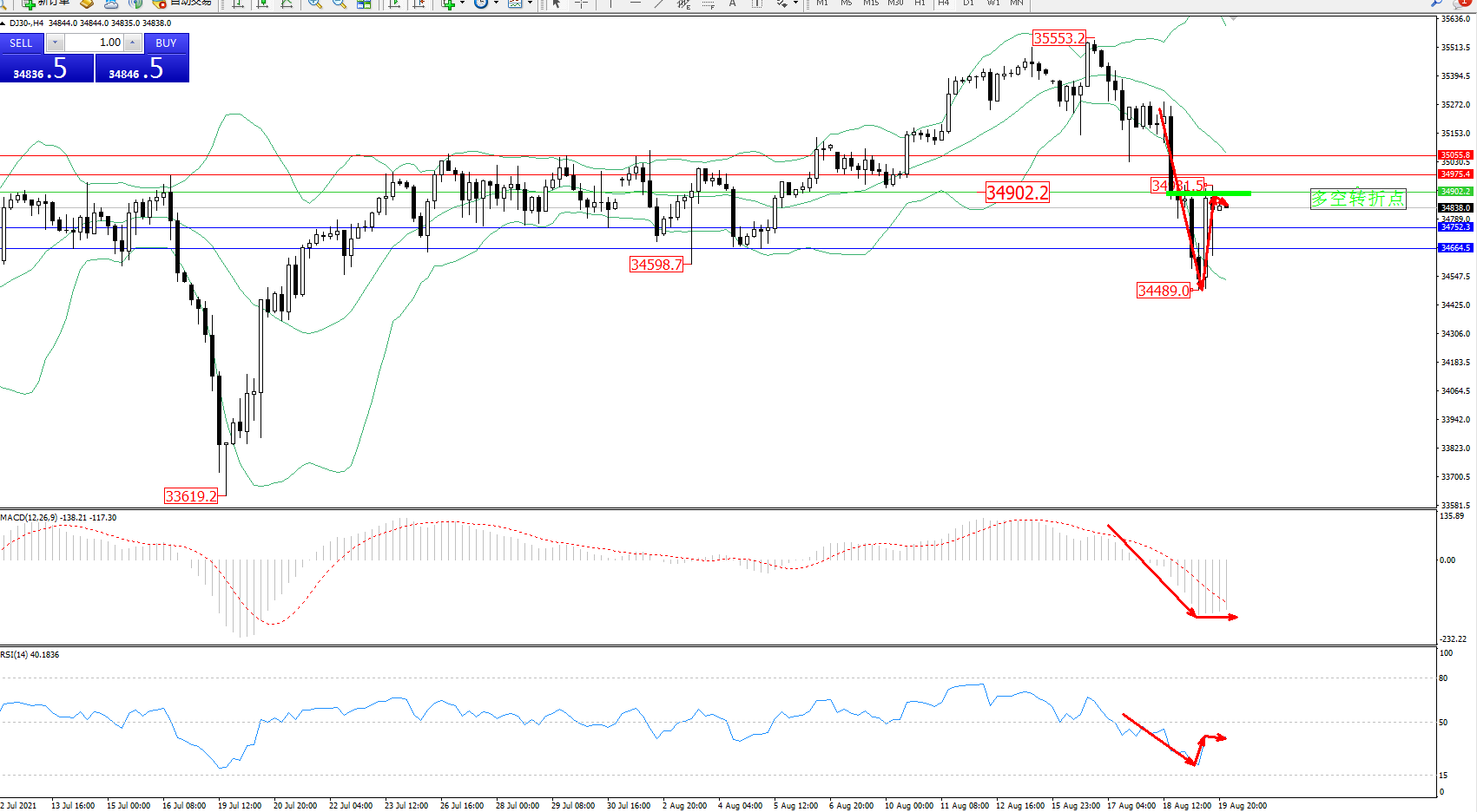 技术点评:空头动力延续布林带指标下轨附近持续震荡下行,低位抵达34489位置后快速回升,布林带指标呈张口走势后开始逐渐收口中,短期或继续延续空头不断下行中,MACD指标处于空头区域震荡下行后开始徘徊,RSI指标处于空头区域低位震荡下行后短暂回升平移;