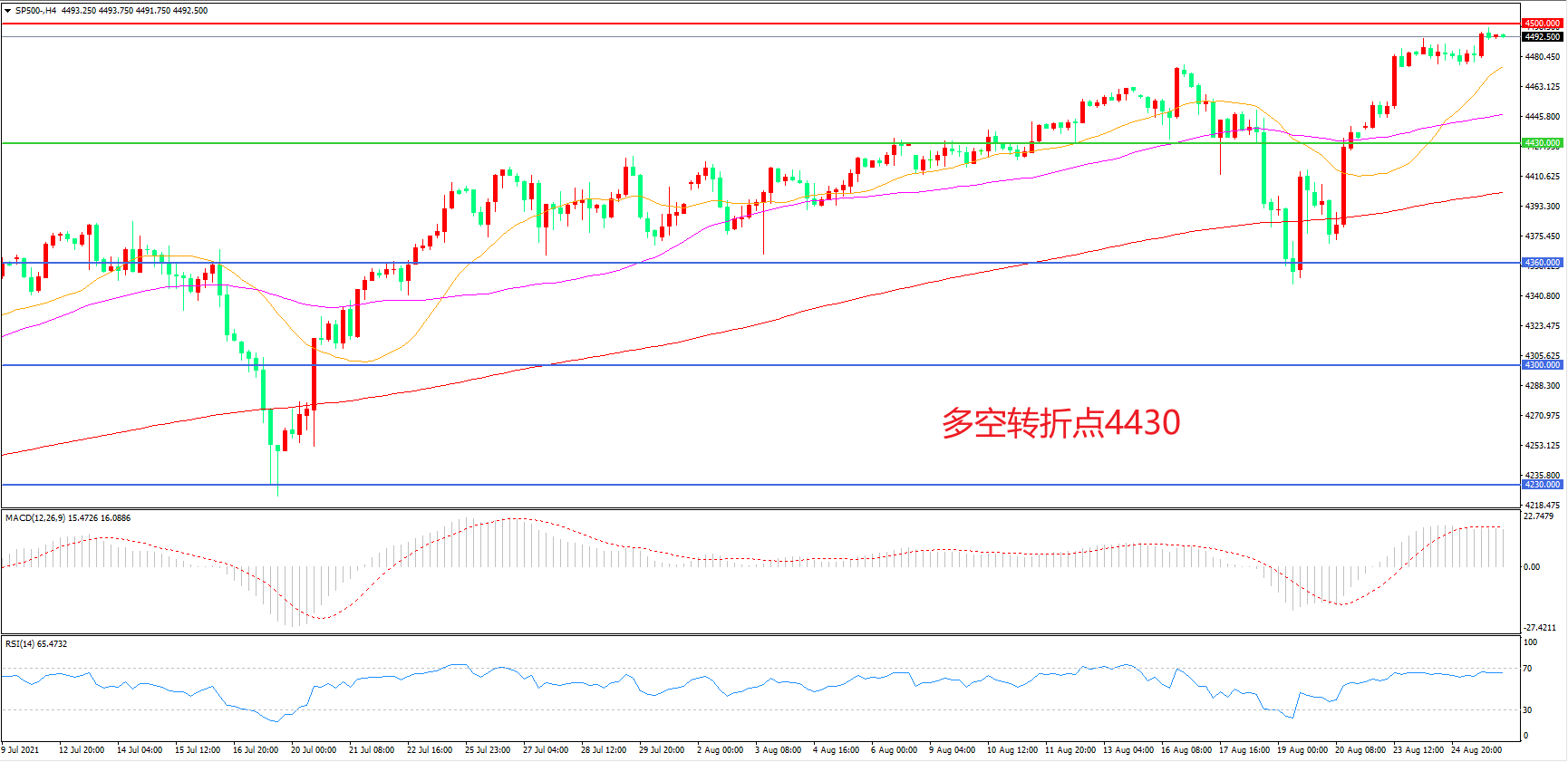 4小时图看,标普500连续拉升,上行动能较强,短期均线拐头向上,4500成为短期阻力,MACD红柱增加,RSI指标走平,日内震荡上行概率较大。