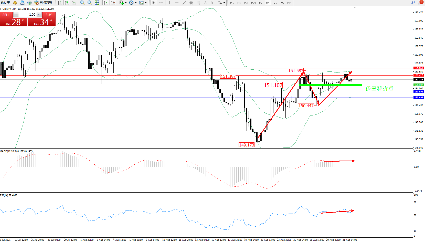 交易策略:151.107上方看涨,目标151.427、151.660