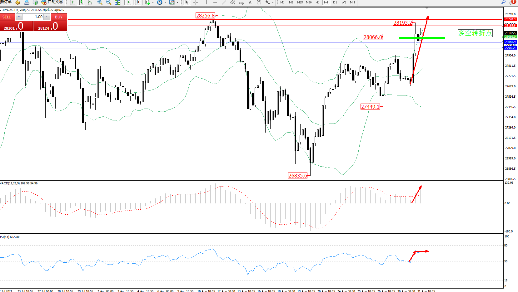 技术点评:多头动力延续布林带指标上轨附近强势拉升上扬,高位抵达28192位置后开始高位短暂震荡,布林带指标呈张口走势持续中,多头动力有进一步向上移动态势,前期高位28256位置近在咫尺,破位在即,MACD指标处于多头区域持续震荡后开始上扬中,RSI指标处于多头区域不断震荡后拉升平移;