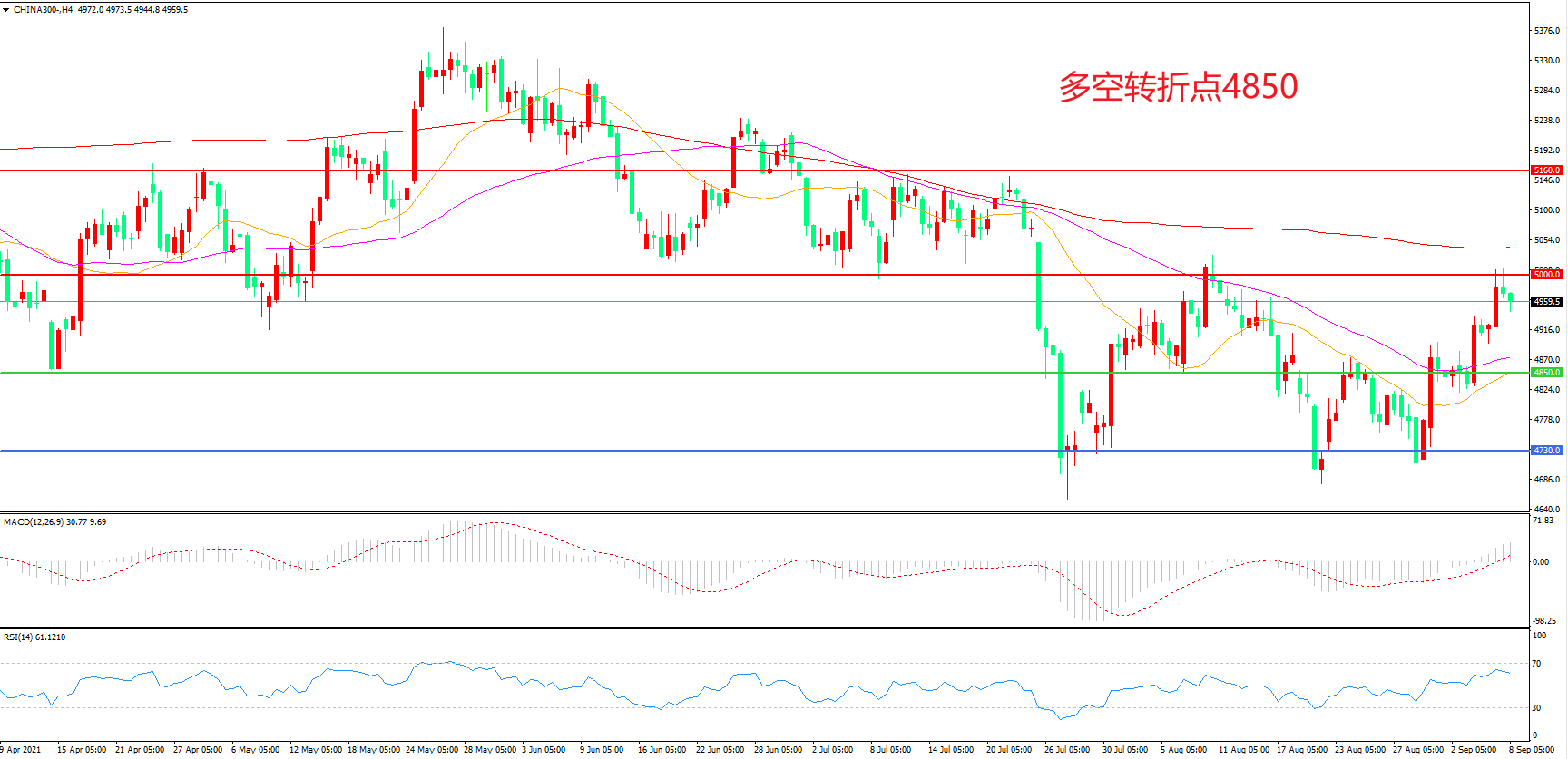 4小时图看,沪深300冲高回落,显示5000点一线阻力较强,均线系统成为下方支撑,200周期均线成为上方阻力,MACD红柱增加,RSI指标走平,日内震荡上行概率较大。