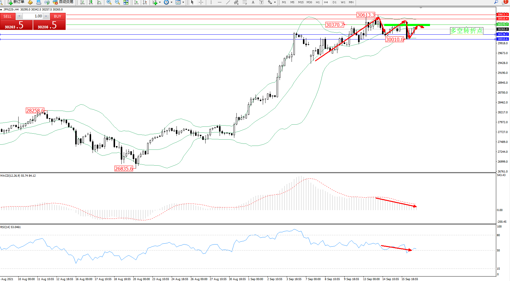 技术点评:多头动力延续布林带指标通道中上轨区间持续震荡上扬,高位抵达30613位置后遇阻开始窄幅整理缓慢平移,空头动力有伺机入场向下移动态势,布林带指标呈收口走势持续平移中,MACD指标处于多头区域维持弱势平缓向下移动,RSI指标纠结于50均衡线附近弱势整理;