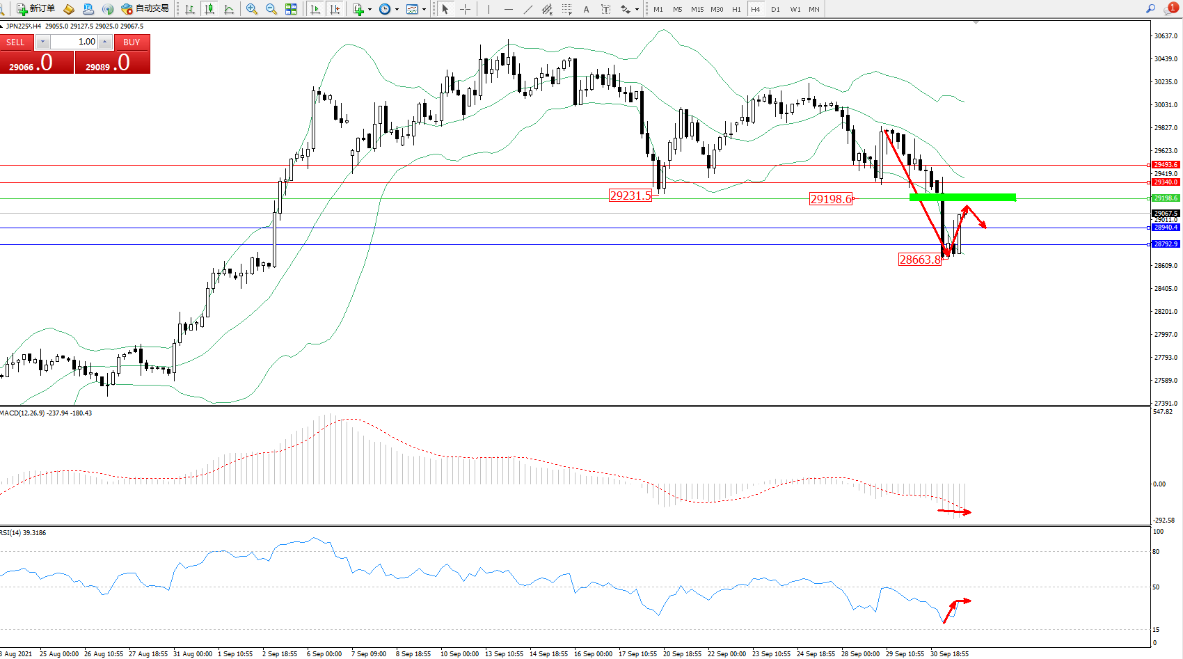 技术点评:空头动力延续布林带指标通道中下轨区间持续震荡下行,低位抵达28663位置后得到短暂支撑回升,但下行趋势态势持续,布林带指标呈缓慢张口走势中,下行趋势良好,MACD指标处于空头区域维持整理,RSI指标处于空头区域维持震荡后缓慢上移整理;