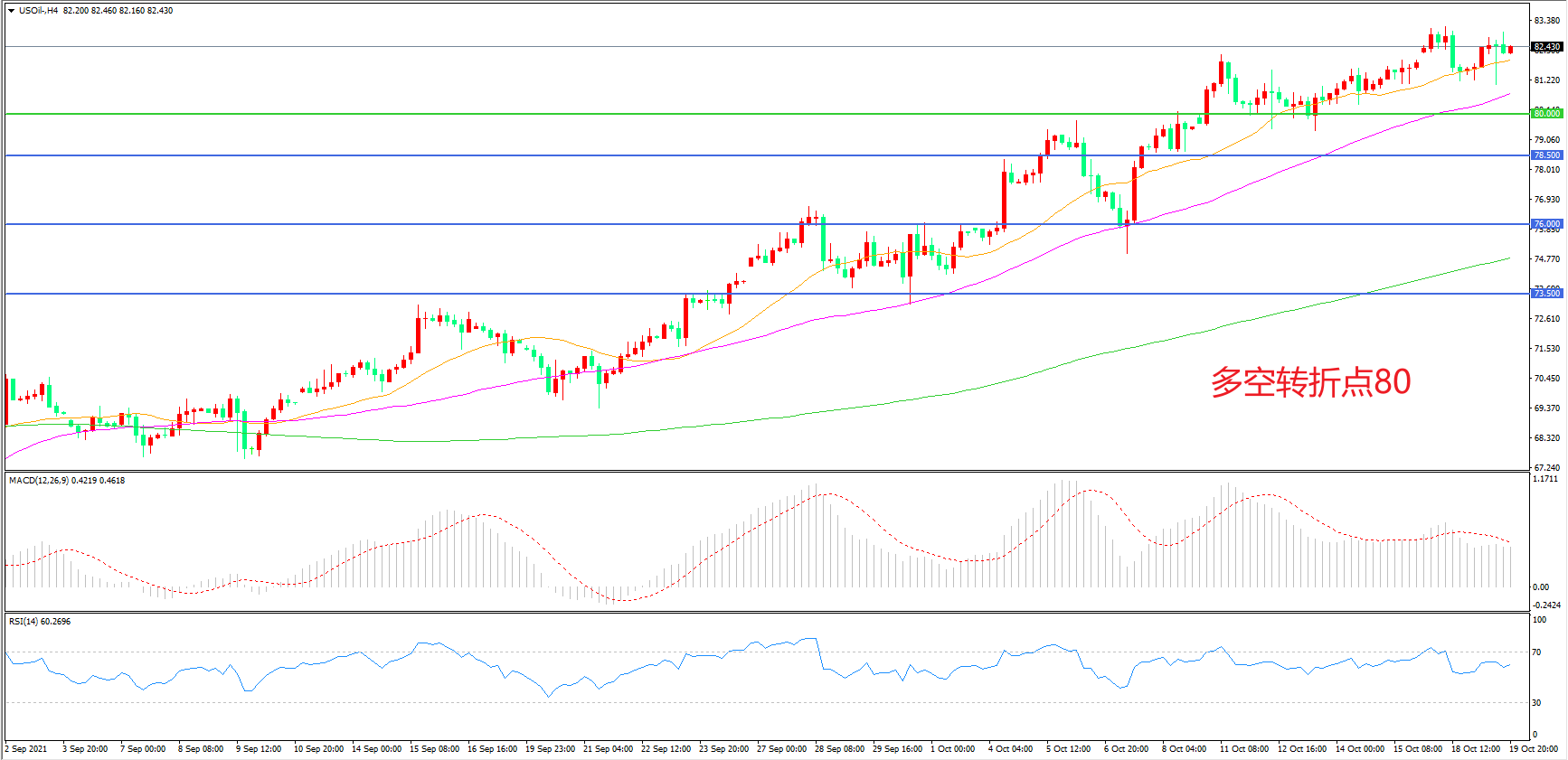 4小时图看,油价以21均线为依托,整体呈现上行形态,MACD红柱增加,RSI指标走平,日内延续上行概率较大。