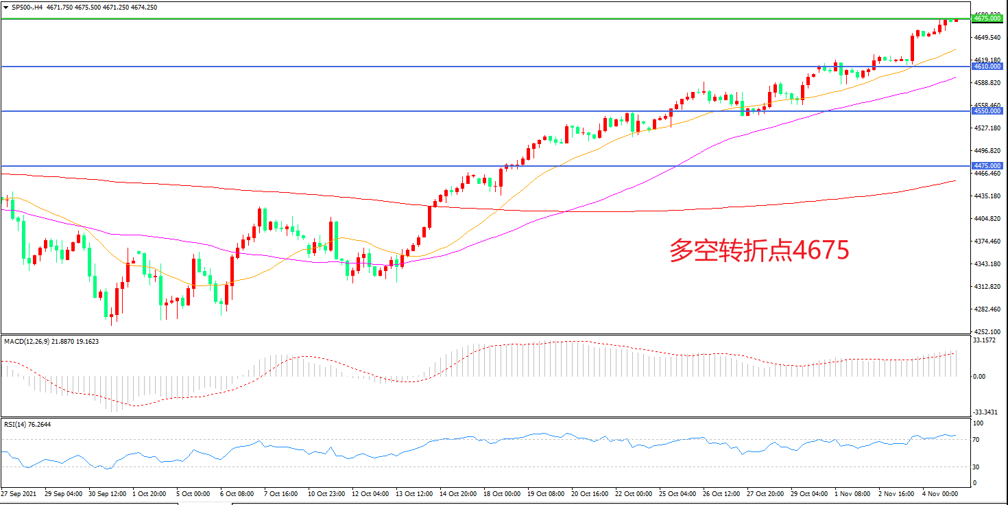 周四(11月4日),美联储主席鲍威尔向释放鸽派信号后,美股多头信心再次受到提振,蓝筹科技股推动标普500继续走高,收报4673.50点。往后看,经济回升与拜登新政将是美股走势的关键,今晚市场将迎来最重磅的非农就业数据,如果数据表现好于市场预期,美股有望再度创出新高。