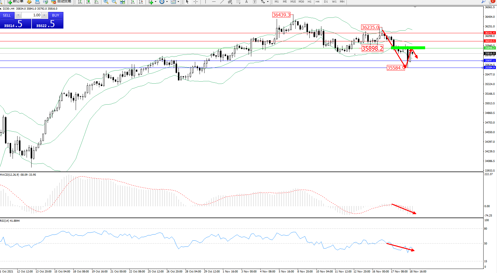 交易策略:35898下方看跌,目标35697、35584