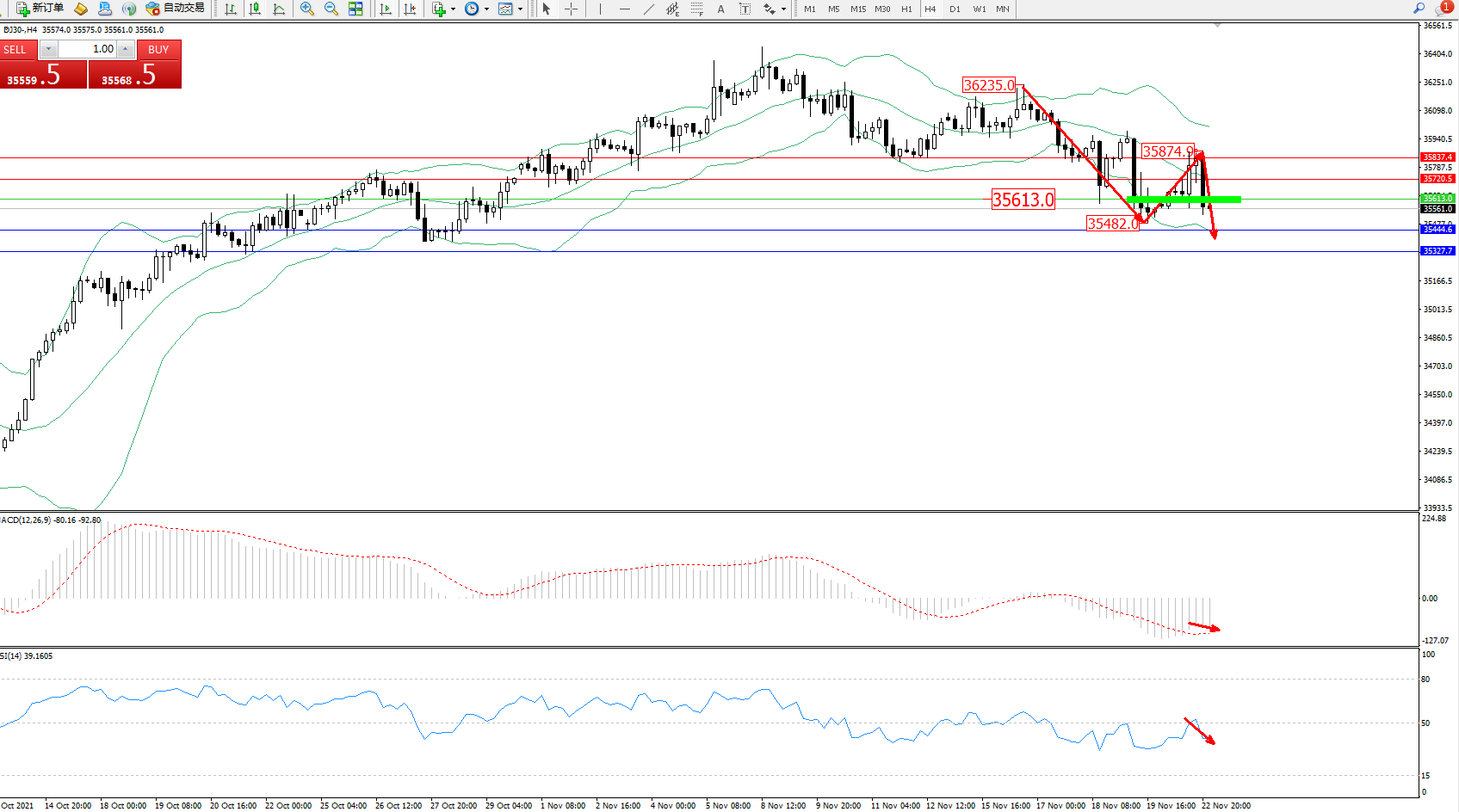 技术点评:高位维持布林带指标通道中下轨区间持续震荡下行,低位抵达35482位置短暂支撑反转上移,触及布林带指标中轨上方35847位置后遇阻再度下行,布林带指标呈张口走势后开始收口持续下行,MACD指标处于空头区域维持整理平移,RSI指标处于50均衡线下方维持震荡中;