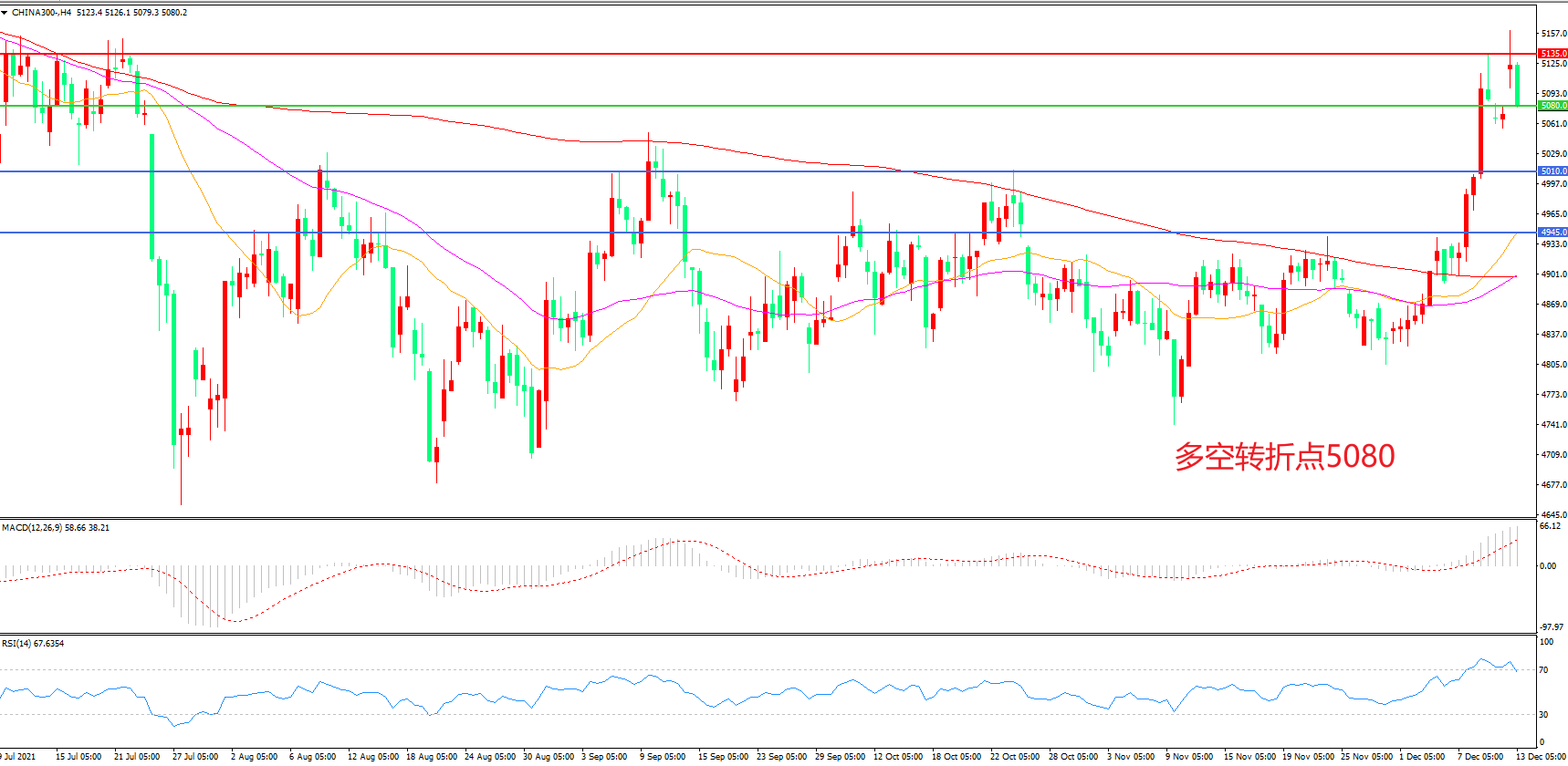 4小时图看,沪深300高开后震荡回落,短期走势出现调整,但收盘价依然前日高点,5080成为多空分水岭,MACD红柱增加,RSI指标走平,日内震荡上行概率较大。