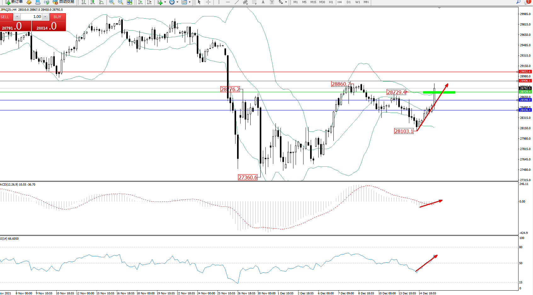 技术点评:空头动力延续布林带指标通道中下轨区间持续震荡下行,低位抵达28103位置后得到支撑反转震荡上移,突破布林带指标上轨附近节点后有继续攀升迹象,布林带指标呈收口走势后开始缓慢张口,MACD指标处于空头区域维持整理后回升至0轴线附近徘徊,RSI指标处于空头区域低位震荡上移至50均衡线上方不断拉升中;
